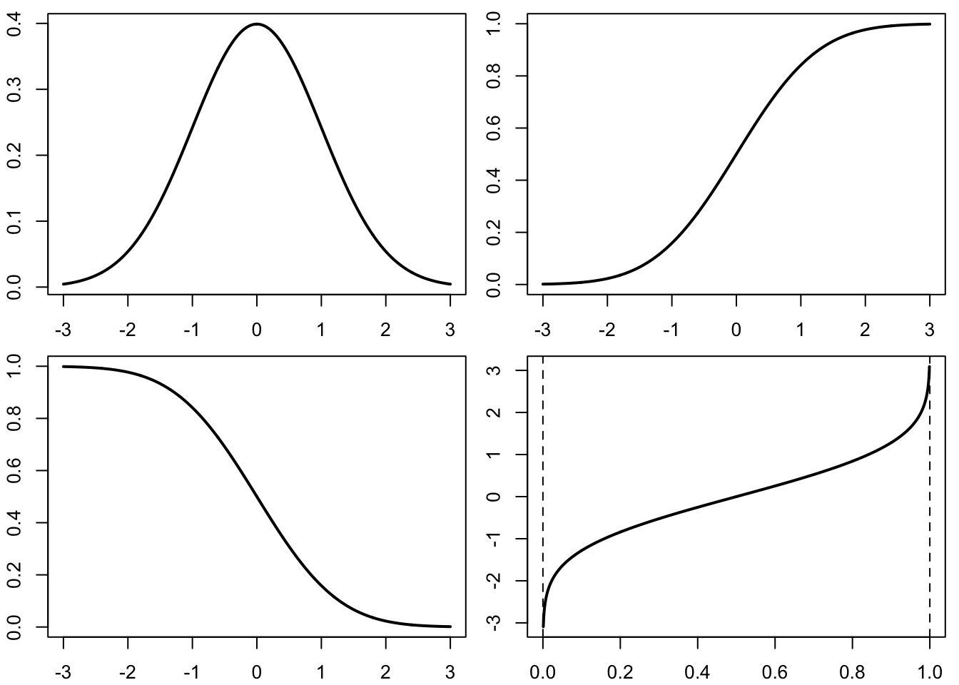 Here are the density, (cumulative) distribution function, survival function, and quantile function of the standard normal distribution (mean 0, variance 1)
