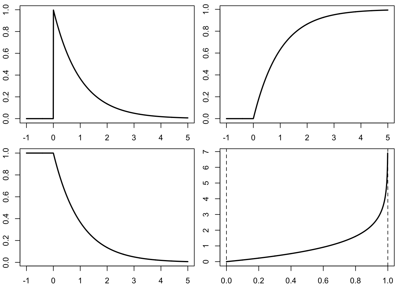 Here are the density, (cumulative) distribution function, survival function, and quantile function of the exponential distribution with rate 1