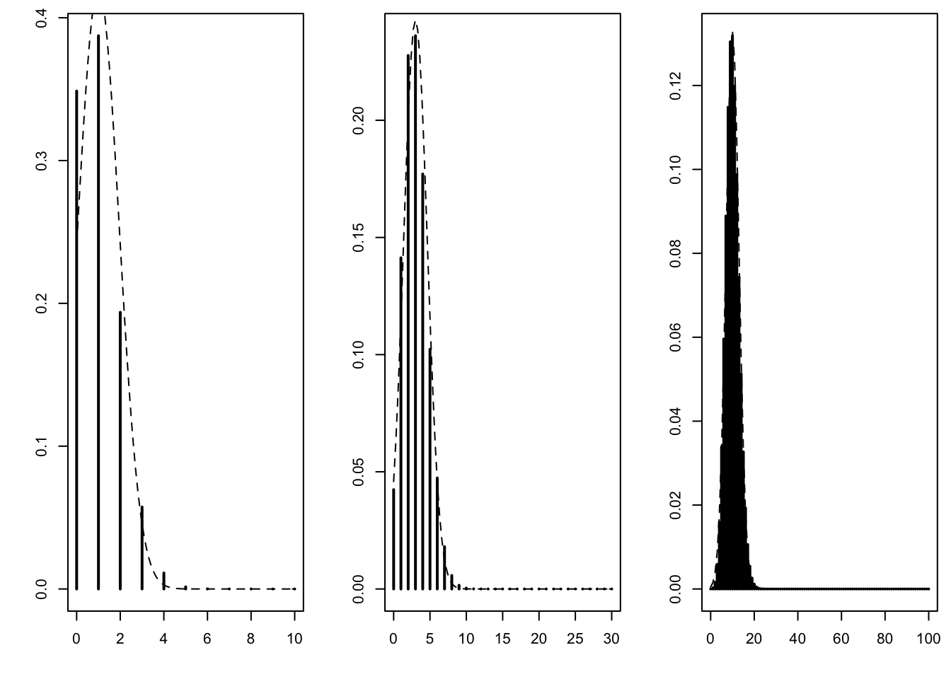 The de Moivre–Laplace theorem says that, as \(n\) increases while \(p\) remains fixed, the binomial distribution with parameters \((n, p)\) is well approximated by the normal distribution with same mean (\(= np\)) and same variance (\(= n p (1-p)\)). To verify this numerically, we fix \(p = 0.10\) and vary \(n\) in \(\{10, 30, 100\}\). We can see that the approximation is already very good when \(n = 100\).