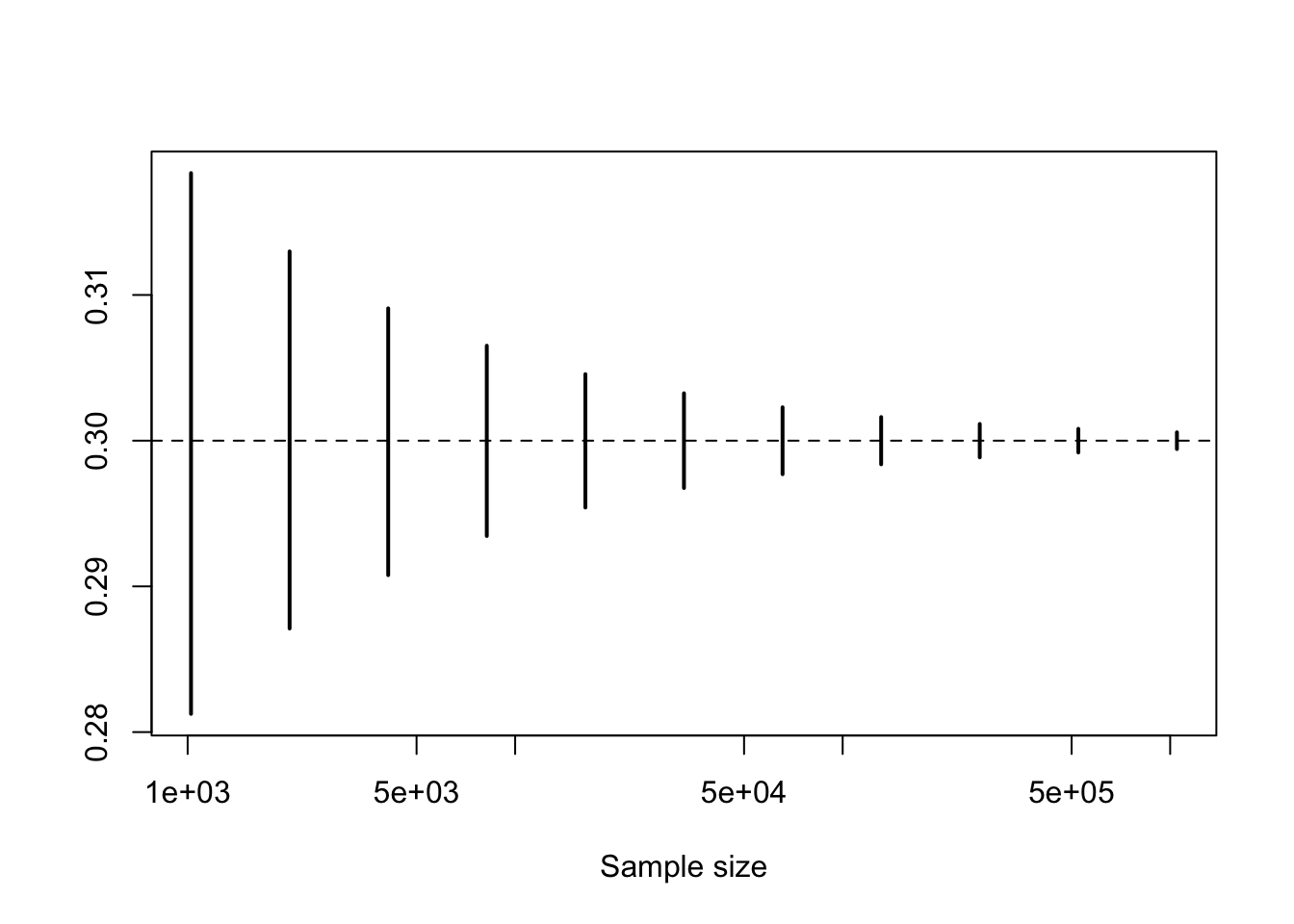 plot(n, rep(p, length(n)), type = "n", ylim = c(min(L), max(U)), xlab="Sample size", ylab = "")