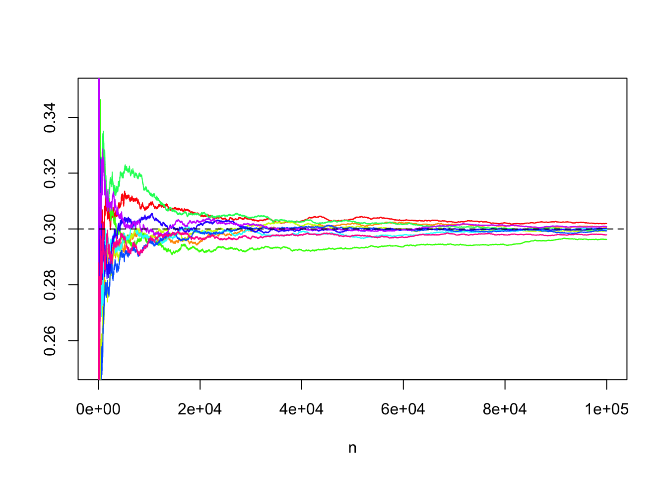 matplot(partial_means, type = "l", lty = 1, col = rainbow(B), xlab = "n", ylab = "", ylim = c(0.25, 0.35))