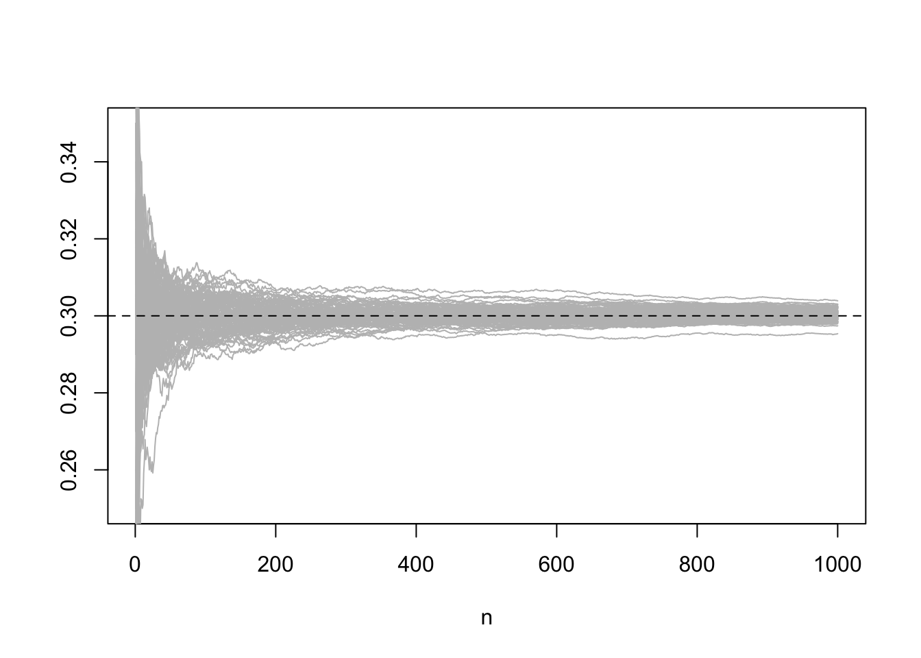 matplot(partial_means[seq(100, N, 100), ], type = "l", lty = 1, col = "grey", xlab = "n", ylab = "", ylim = c(0.25, 0.35))