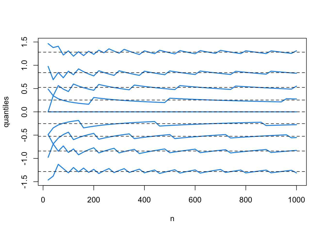 matplot(n, Q, type = "l", lty = 1, lwd = 2, col = 4, xlab = "n", ylab = "quantiles")