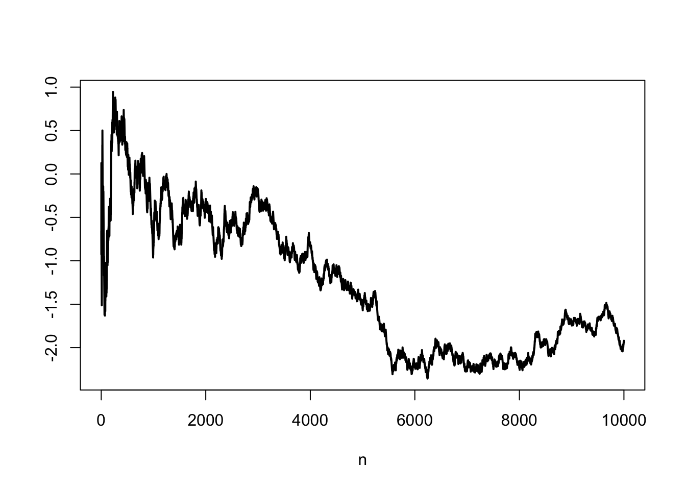 plot(1:N, standardized_partial_sums, type = "l", lwd = 2, xlab = "n", ylab = "")
