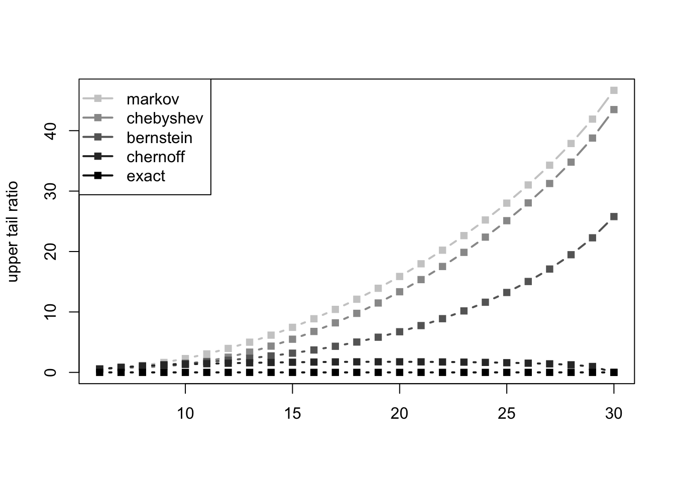 legend("topleft", legend = c("markov", "chebyshev", "bernstein", "chernoff", "exact"), lty = 1, lwd = 2, pch = 15, col = grey((4:0)/5))