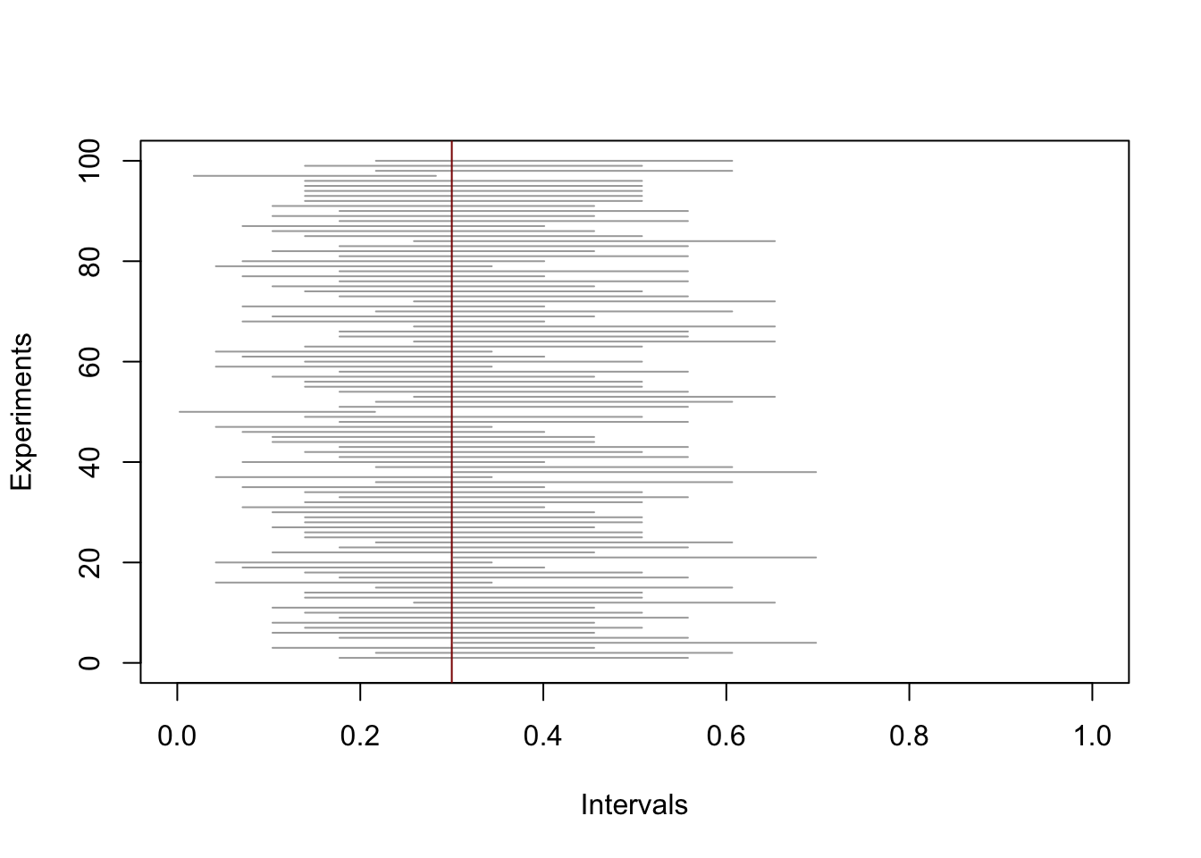 plot(0, 0, type = "n", xlim = c(0, 1), ylim = c(0, B), xlab = "Intervals", ylab = "Experiments", cex.lab = 1)