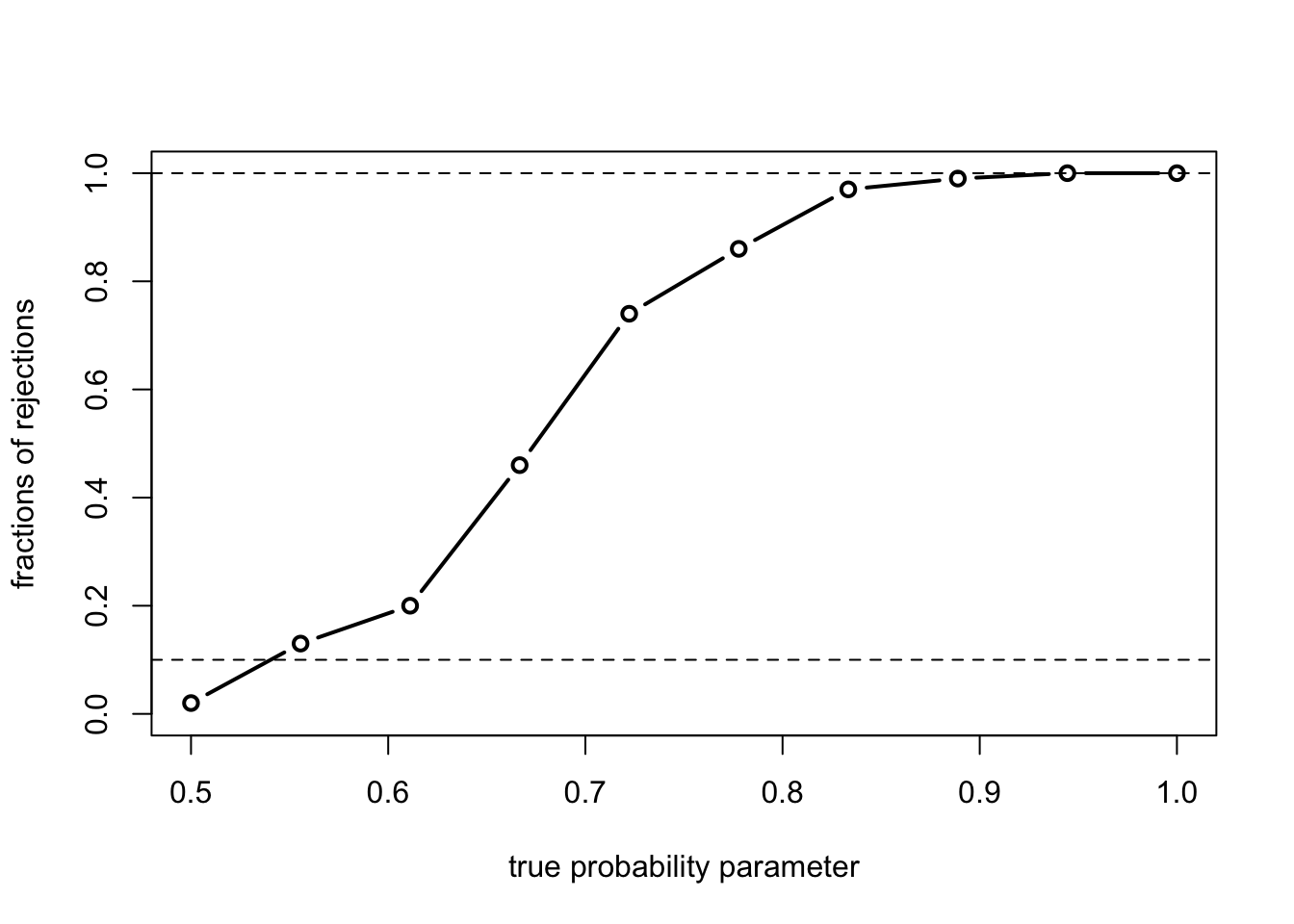 Similarly, the outcome of a test is random, that is, before it is numerically evaluated on observed data. The probability of rejecting by mistake (a Type I error) is the size of the test, which is controlled by the level when the test is properly calibrated. In the same context of a binomial experiment with parameters \((\theta, n)\), with \(n\) given, the likelihood ratio test for the null hypothesis \(\theta \le \theta_0\) rejects for large values of \(Y\), the number of heads. (This test corresponds to a one-sided Clopper–Pearson confidence interval.) Suppose \(\theta_0 = 1/2\) and that we are testing at the \(\alpha = 0.10 = 10\%\) level. The critical value is given by \[c = \min\{c': \mathbb{P}_{1/2}(Y \le c') \ge 1-\alpha\},\] which is here equal to