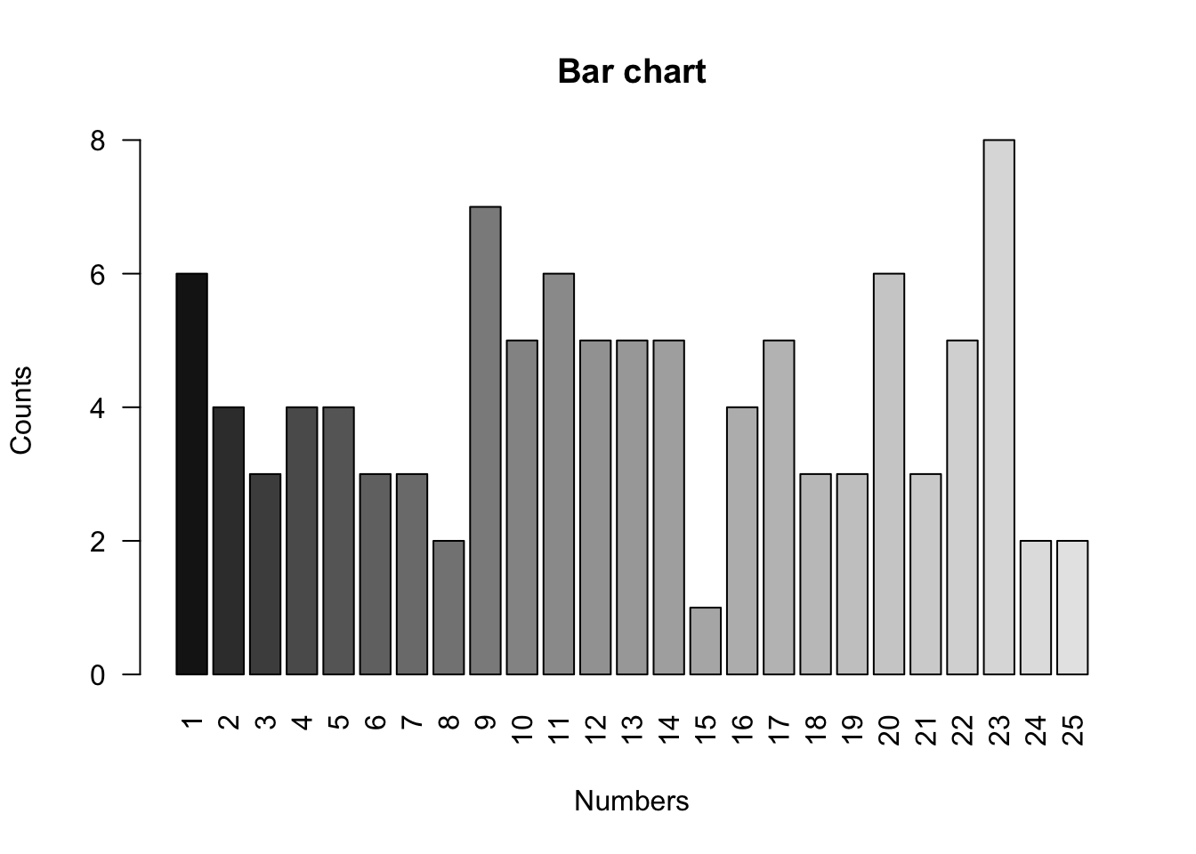 barplot(counts, names.arg = 1:25, xlab = "Numbers", ylab = "Counts", main = "Bar chart", col = colors, las = 2)