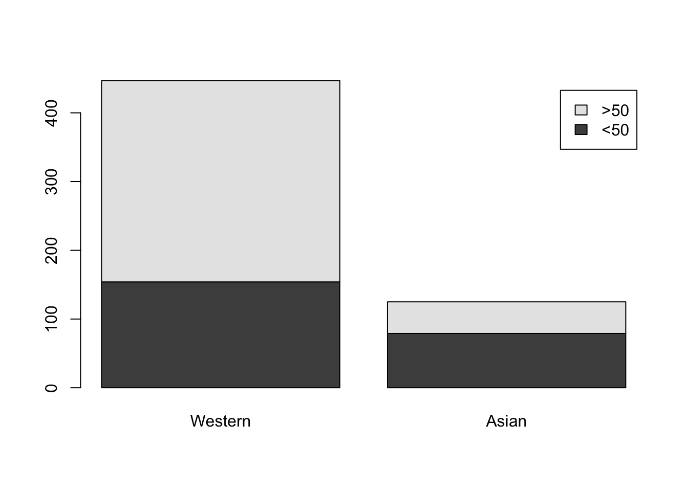 barplot(tab, legend.text = c("<50", ">50"))