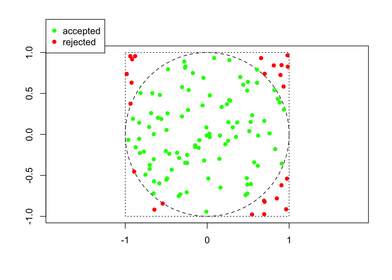 Here is a simple example of rejection sampling, where the goal is to sample uniformly at random from the unit disc. The approach is based on sampling the unit square (which contains the unit disc) uniformly at random (which is straightforward) and only keeping those draws that fall in the disc.