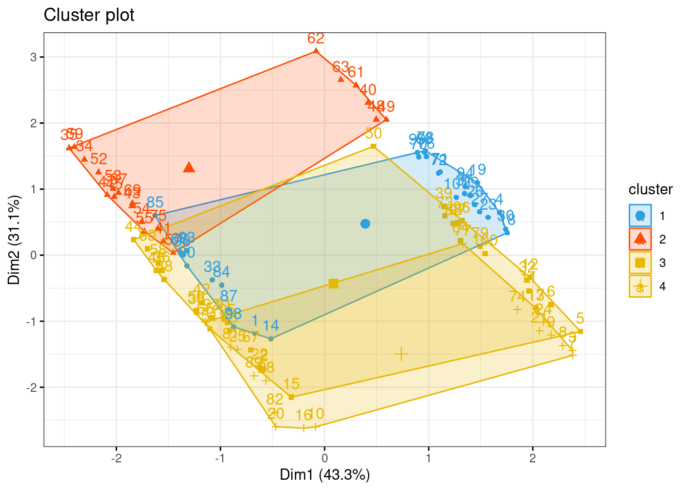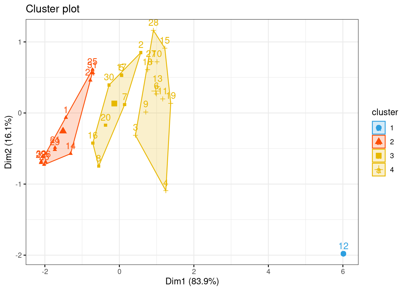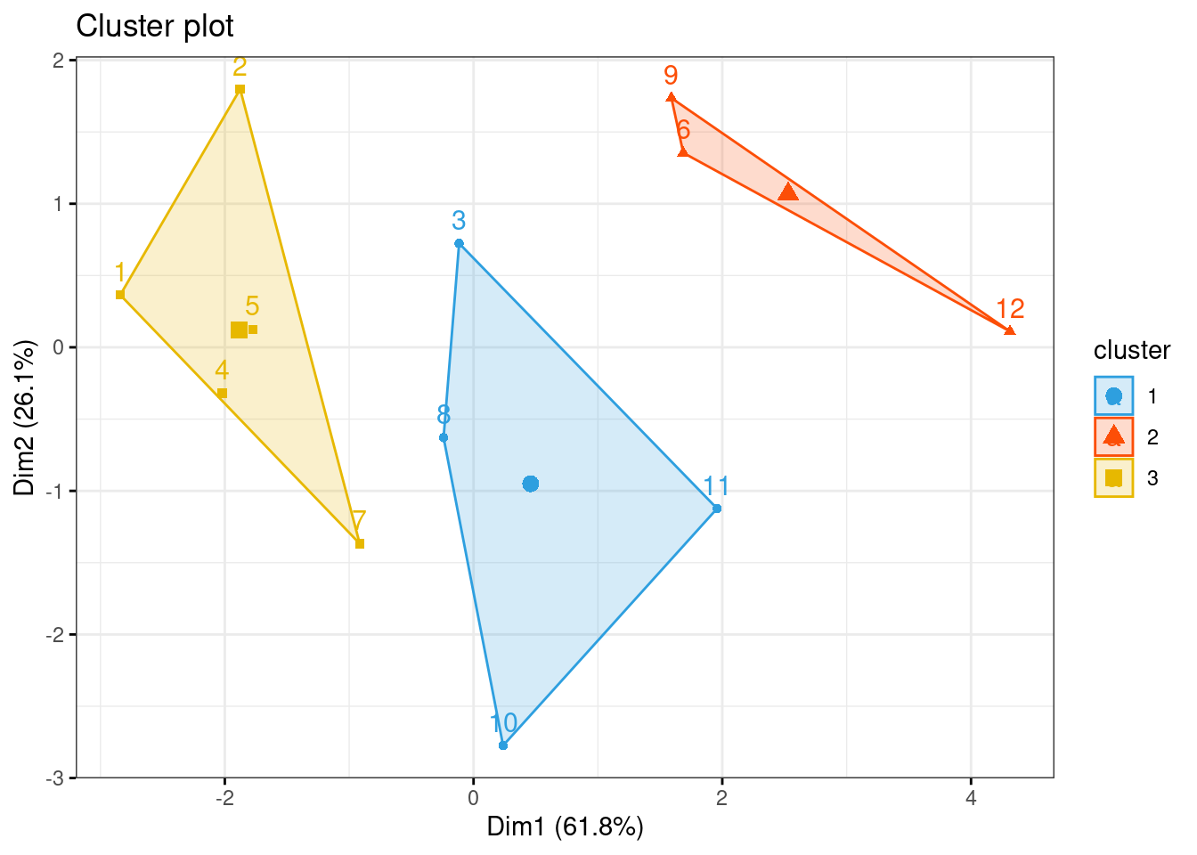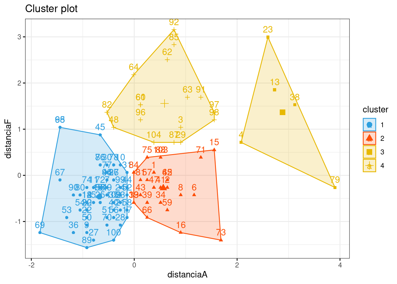 groups <- cutree(grup, k=3)table(groups, disco$deslocamento)##