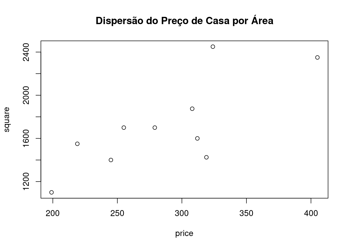 plot(price,square,main="Dispersão do Preço de Casa por Área")