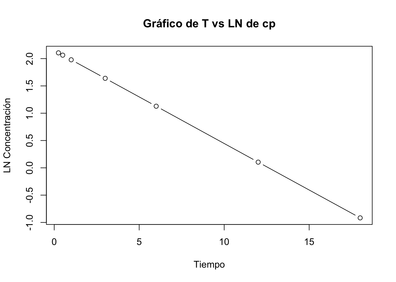 Dado que no se especifican las unidades de \(Cp\) asumiremos que son \(\mu g/ L\) Del problema podemos obtener: - \(Cp0=15 \ \mu g /L\) - \(K_{el}= 0.250 \ h ^{-1}\)