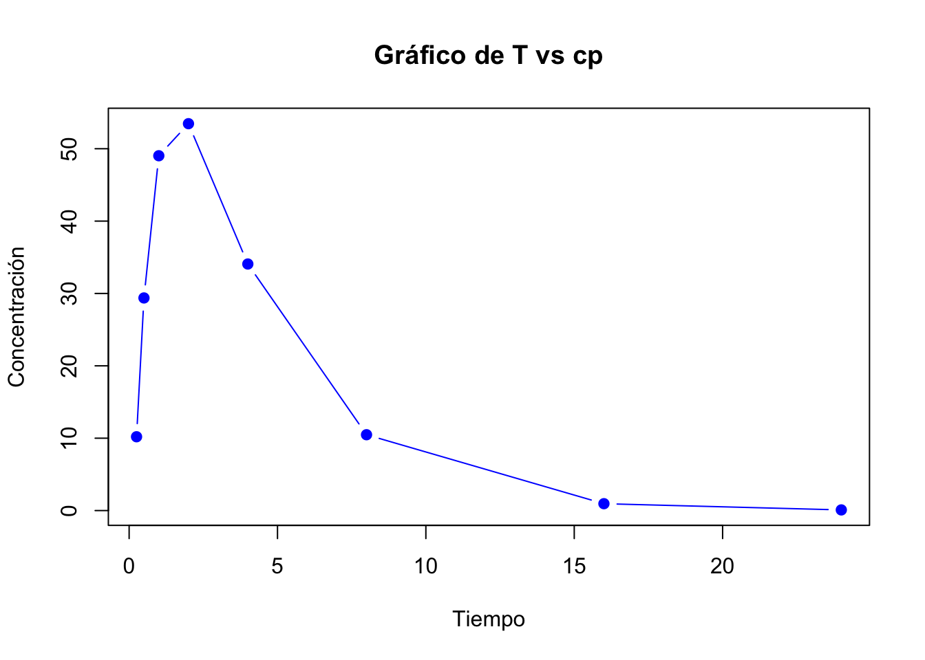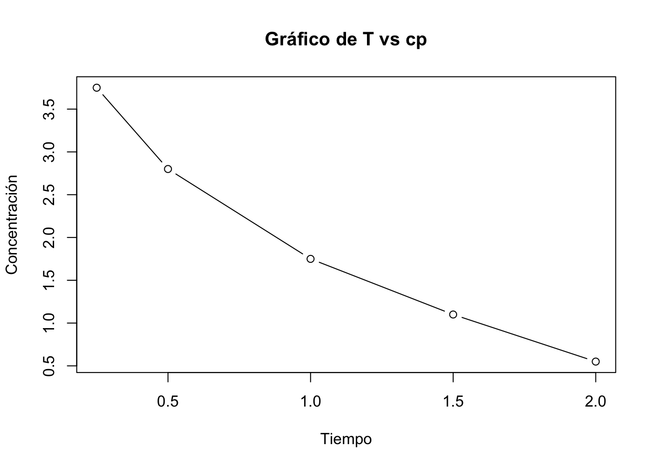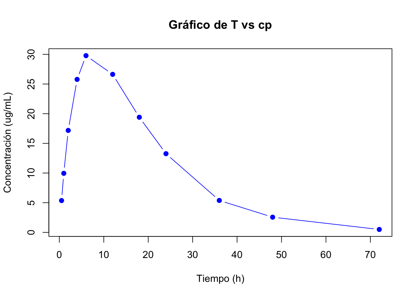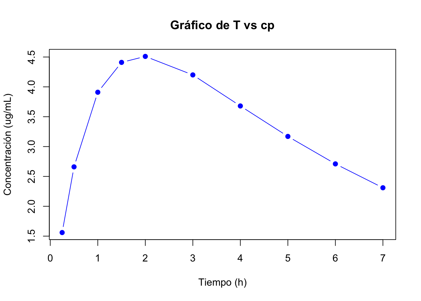 Ejemplo 2.1 En el estudio de biodisponibilidad de unos comprimios de 500 mg de principio activo, se obtienen los datos de concentraciones plasmáticas que se detallan en la siguiente tabla: