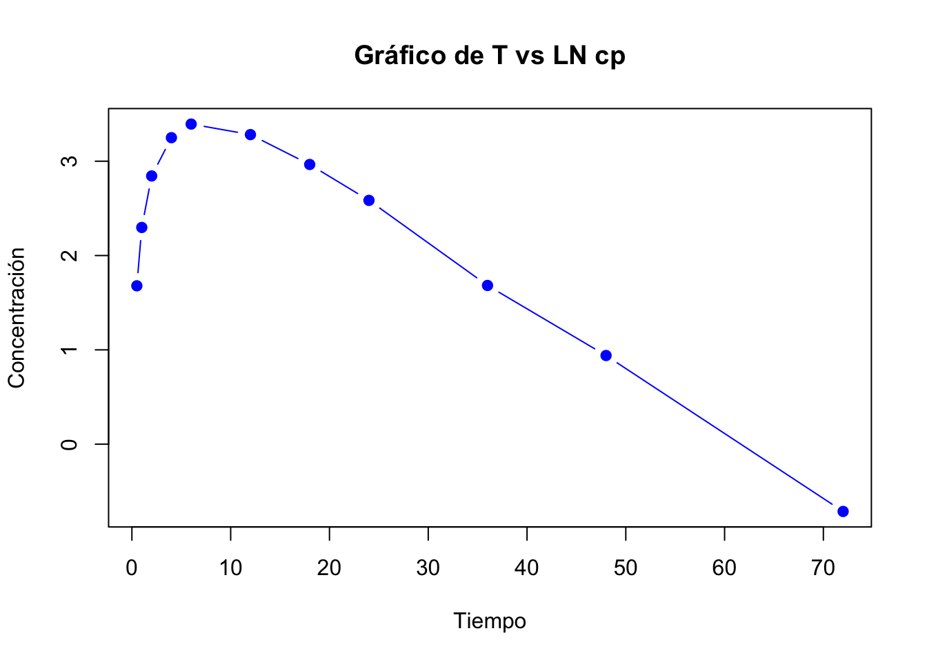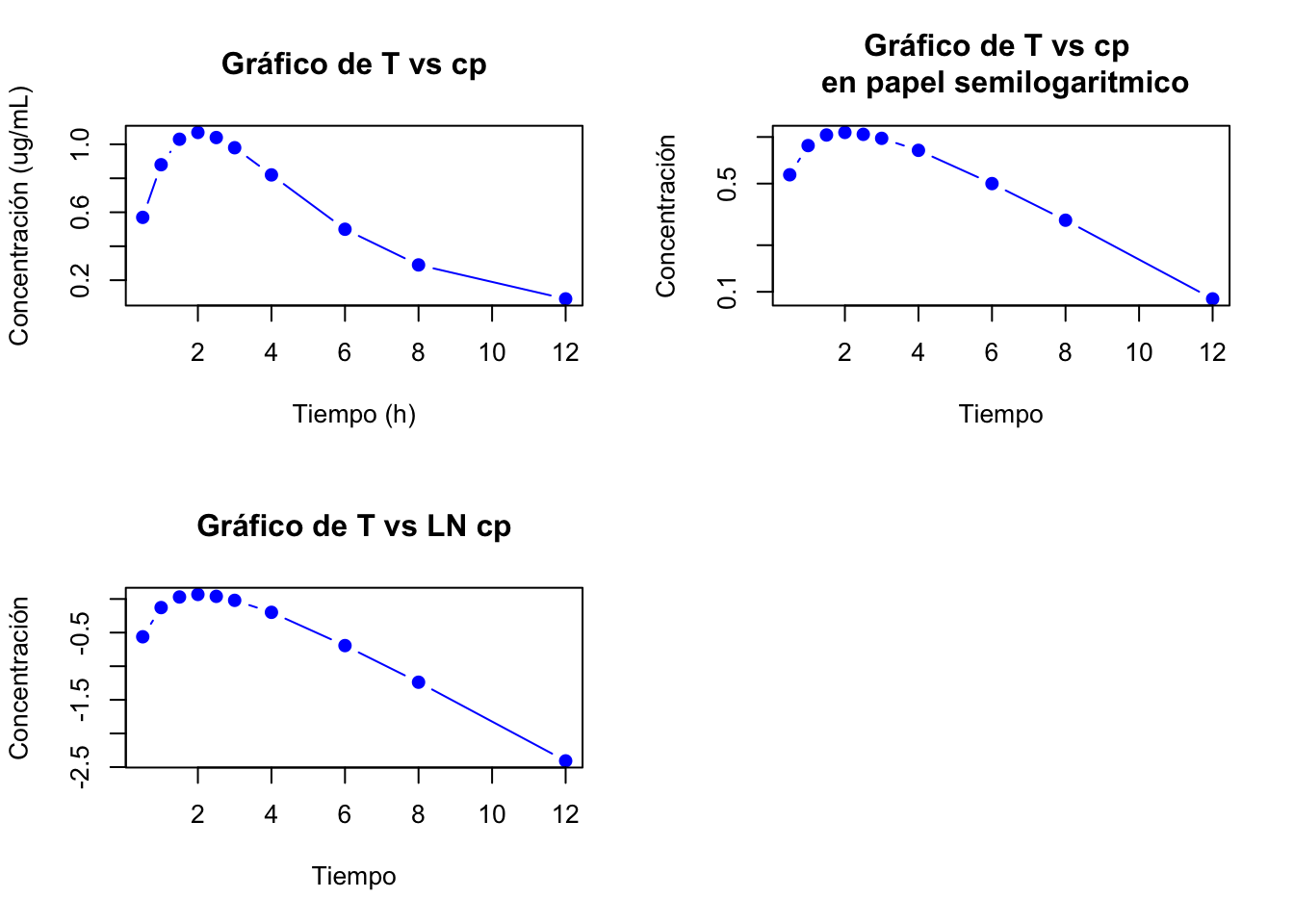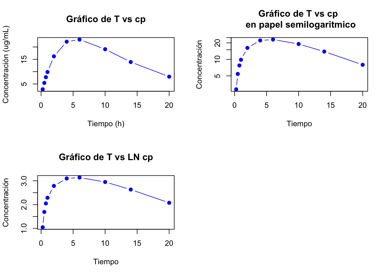 Ejemplo 2.1 En el estudio de biodisponibilidad de unos comprimios de 500 mg de principio activo, se obtienen los datos de concentraciones plasmáticas que se detallan en la siguiente tabla: