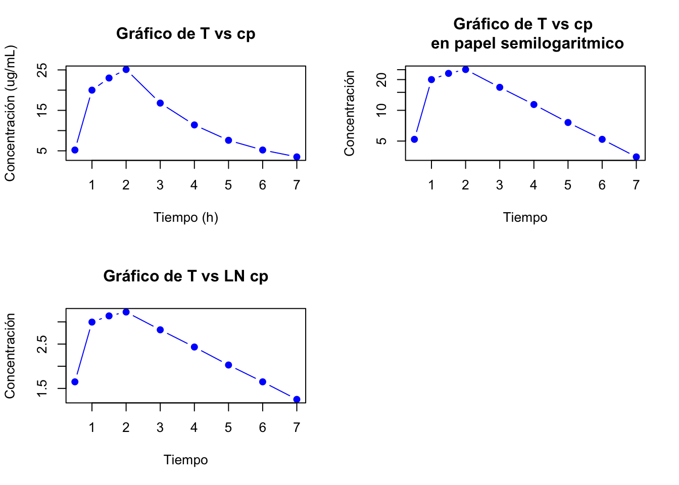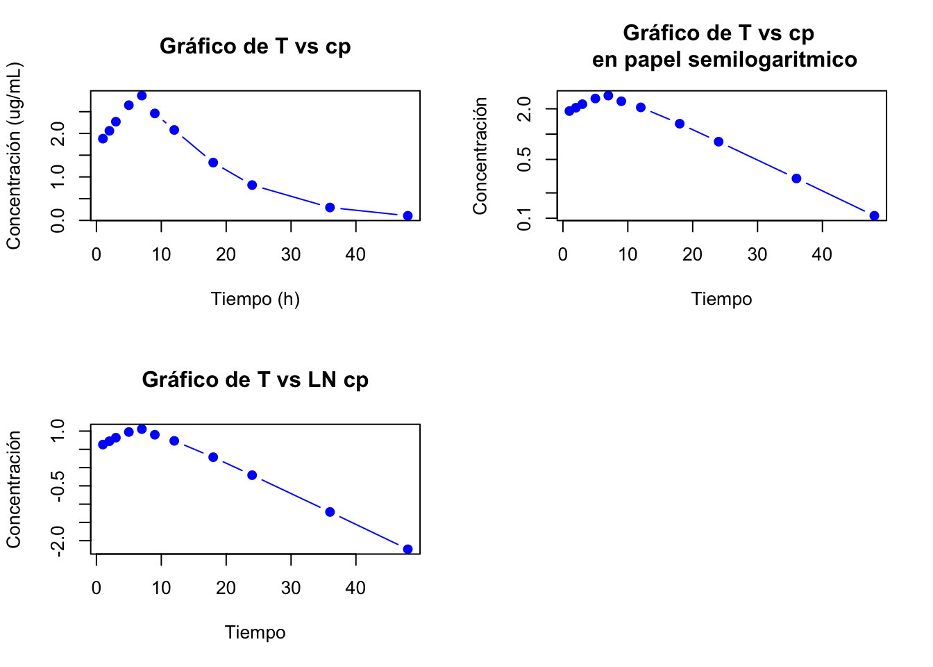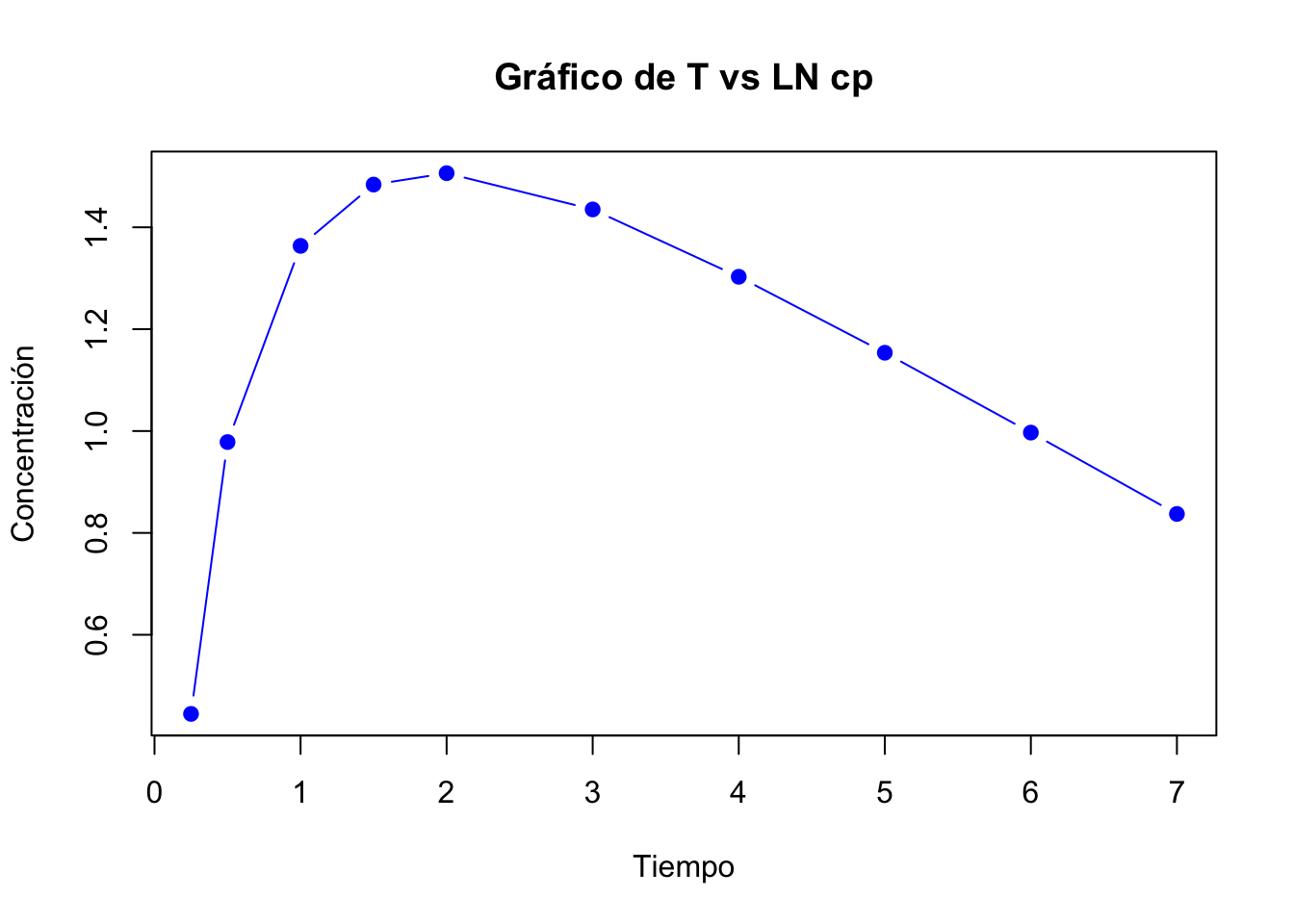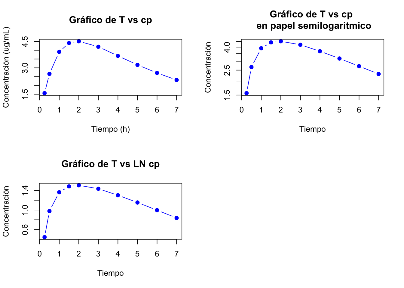 Ejemplo 2.1 En el estudio de biodisponibilidad de unos comprimios de 500 mg de principio activo, se obtienen los datos de concentraciones plasmáticas que se detallan en la siguiente tabla: