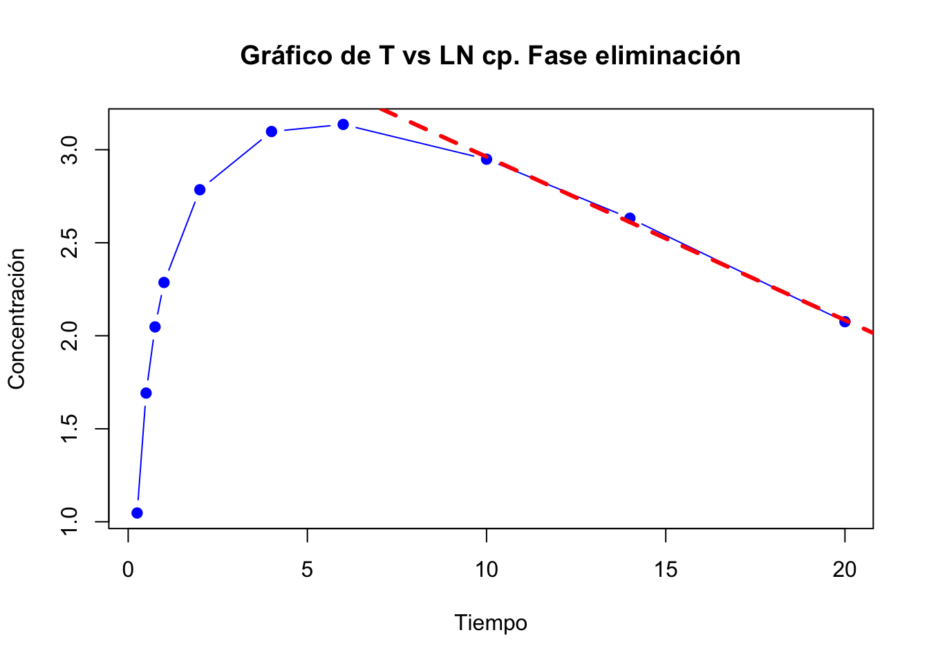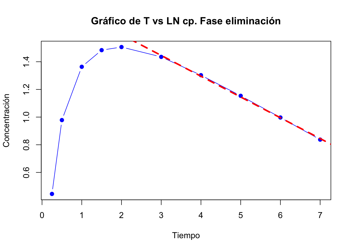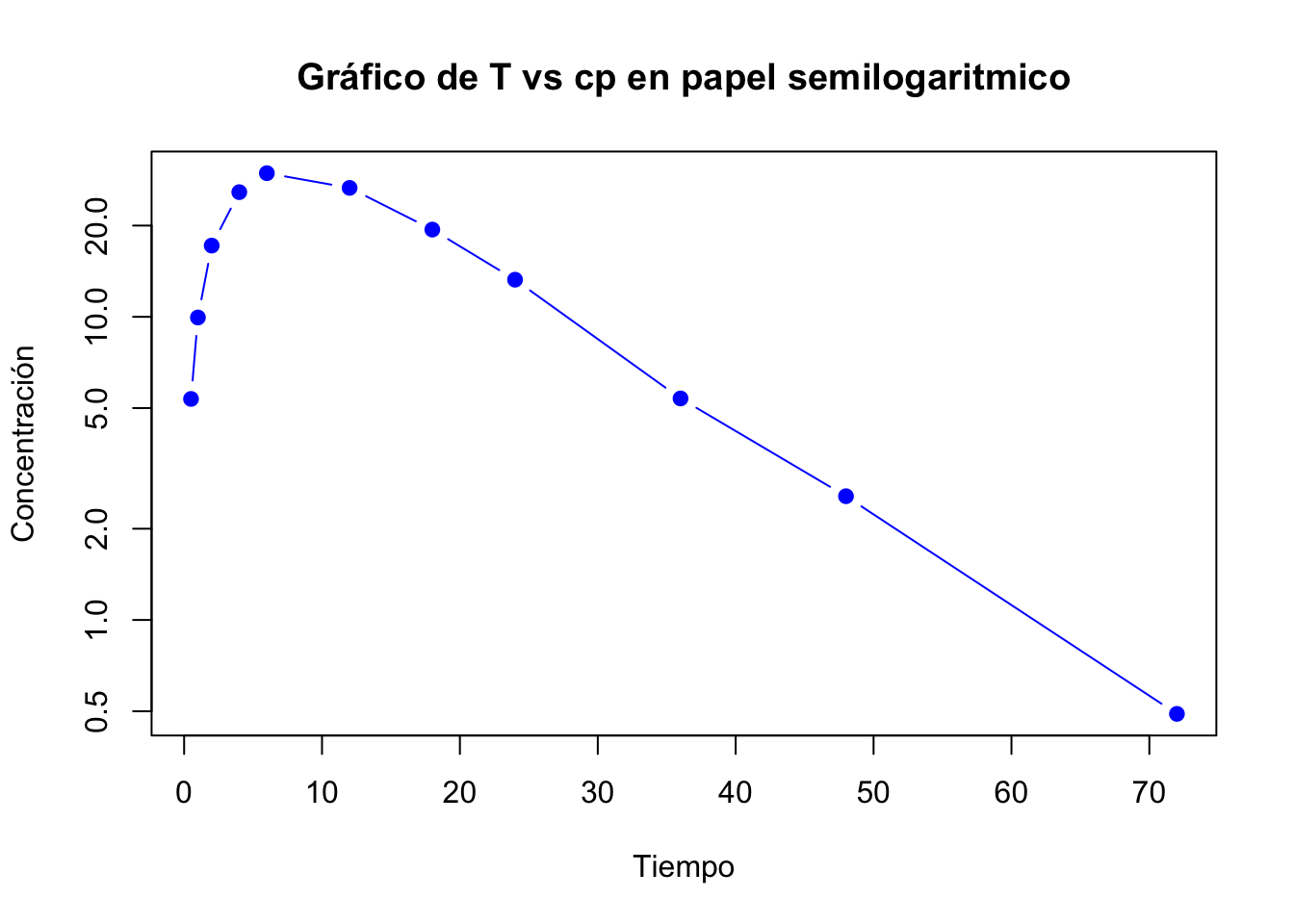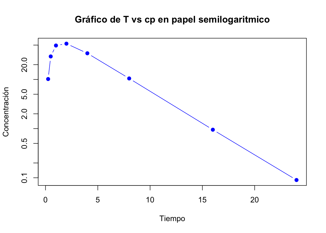 \[ Cpmax= 45 \cdot (e^{-0.17 \cdot 1.64}-e^{-1.5 \cdot 1.64})=30.2 \mu g/mL \] Para el tiempo de \(t_{1/2}\)