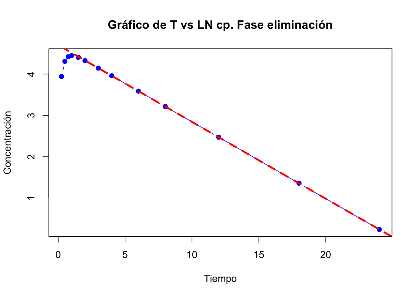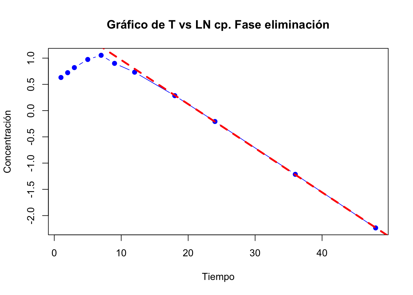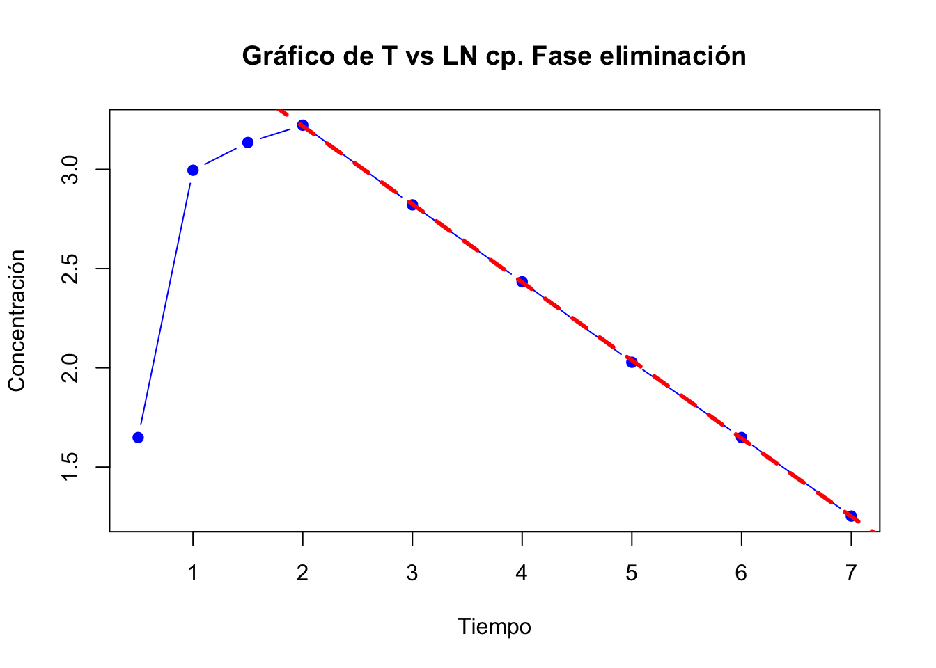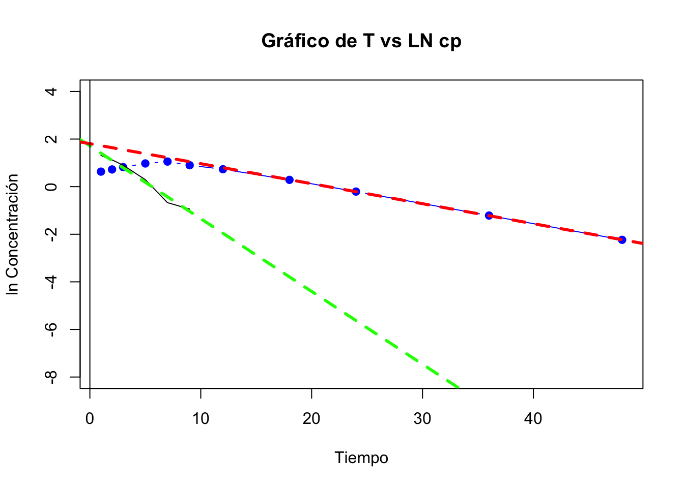 \[ Cpmax= 45 \cdot (e^{-0.17 \cdot 1.64}-e^{-1.5 \cdot 1.64})=30.2 \mu g/mL \] Para el tiempo de \(t_{1/2}\)
