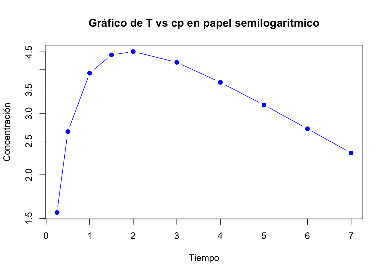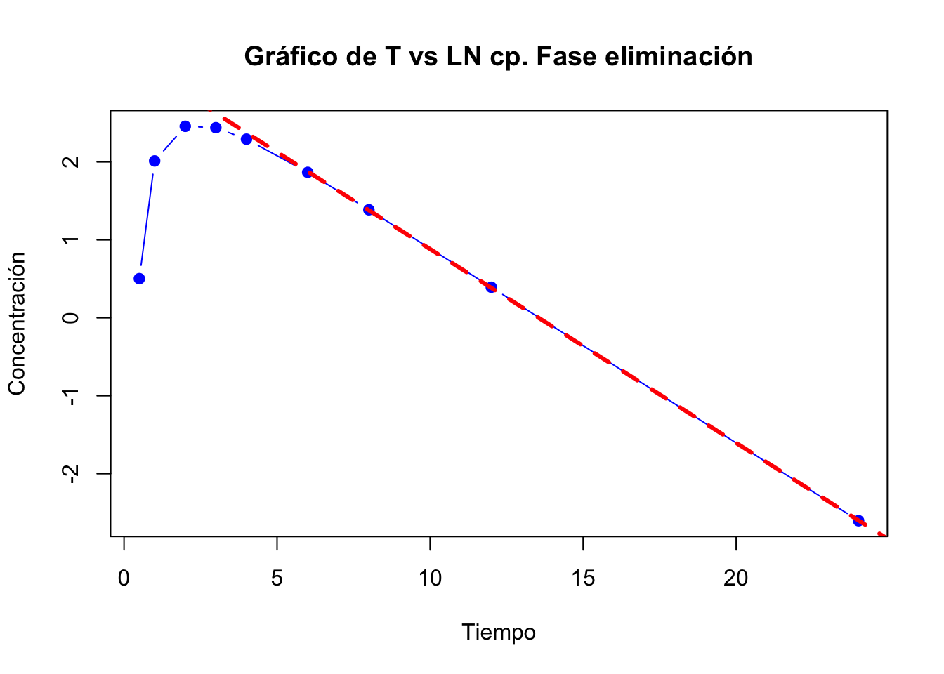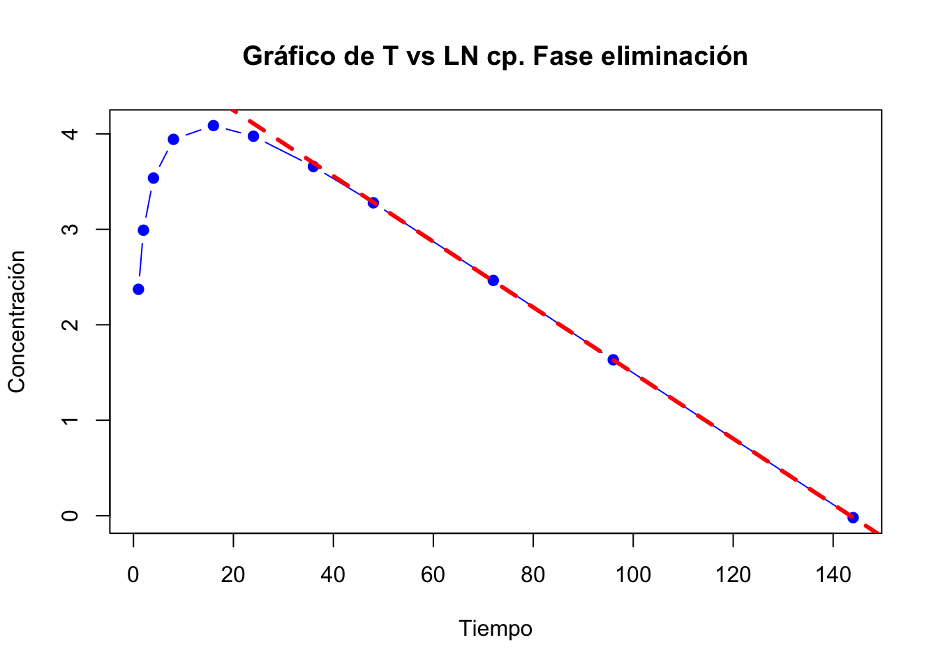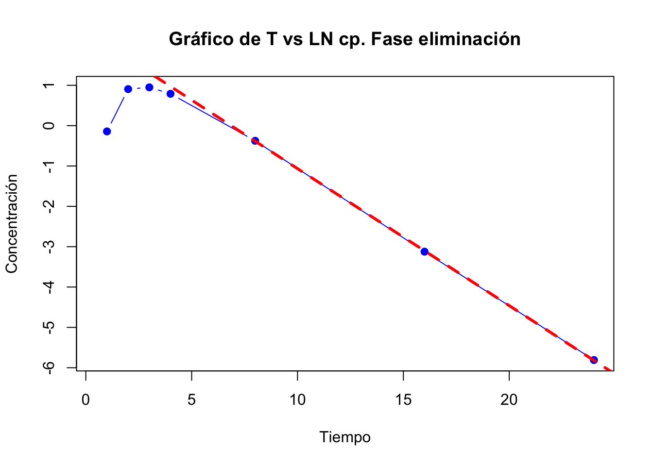 \[ Cpmax= 45 \cdot (e^{-0.17 \cdot 1.64}-e^{-1.5 \cdot 1.64})=30.2 \mu g/mL \] Para el tiempo de \(t_{1/2}\)