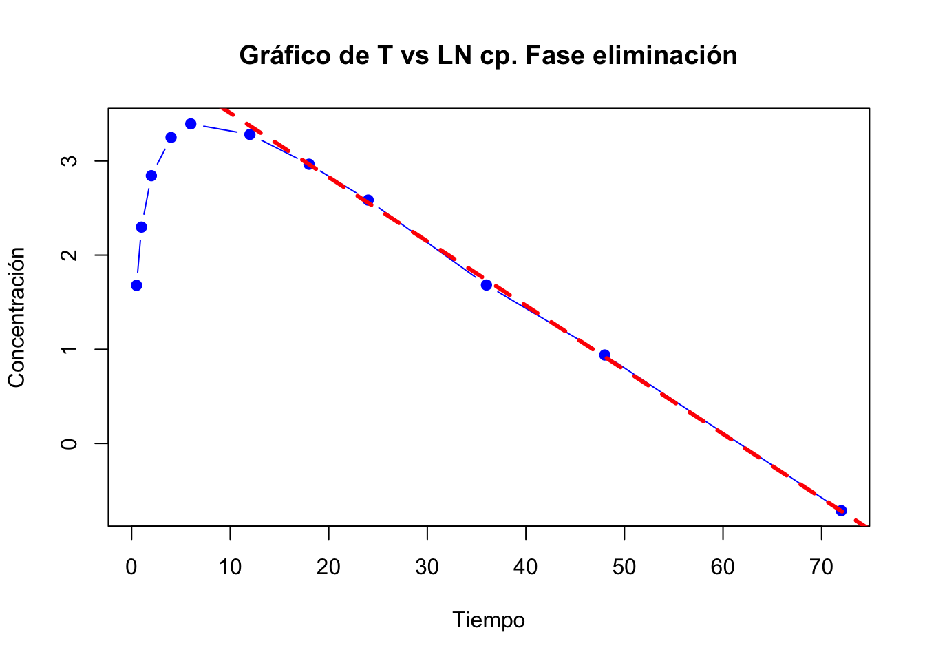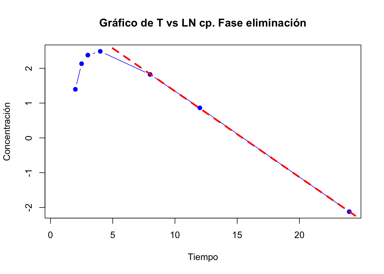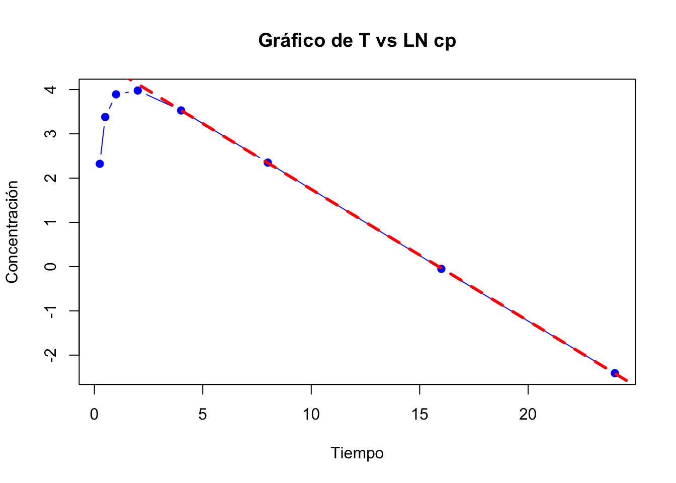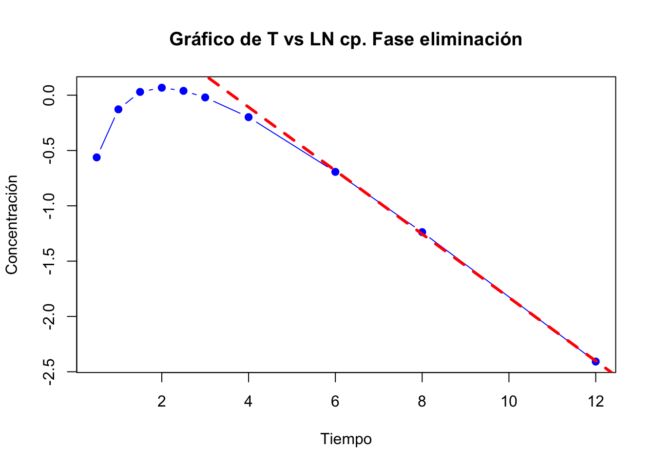 \[ Cpmax= 45 \cdot (e^{-0.17 \cdot 1.64}-e^{-1.5 \cdot 1.64})=30.2 \mu g/mL \] Para el tiempo de \(t_{1/2}\)