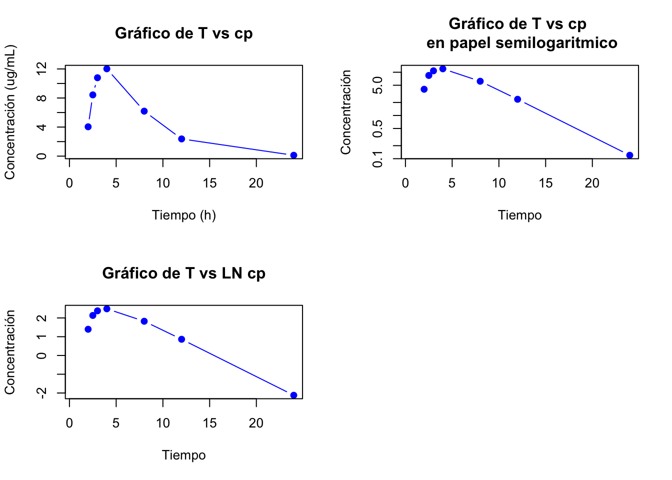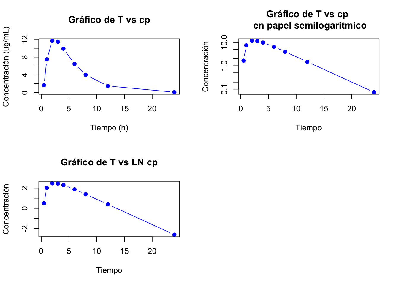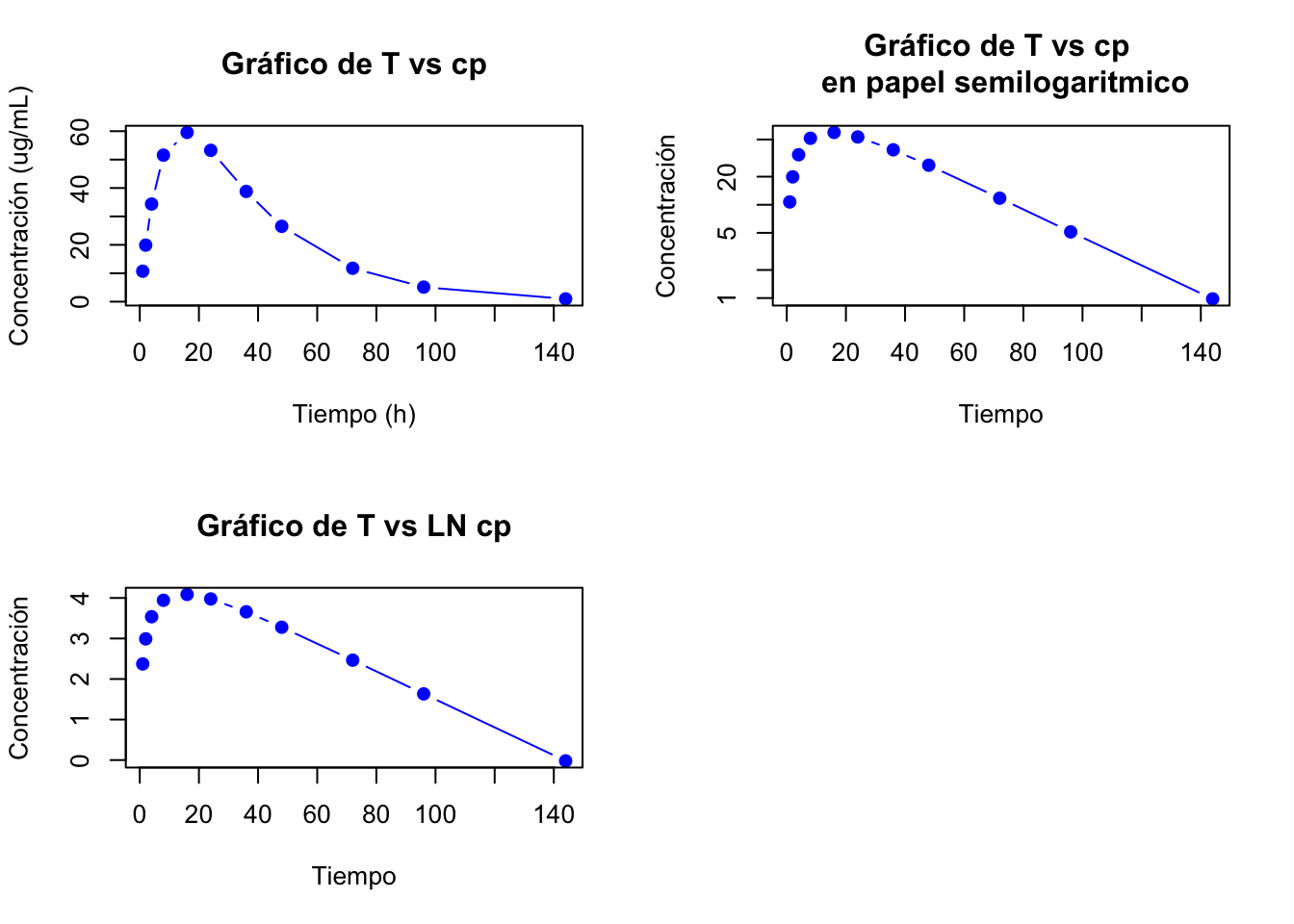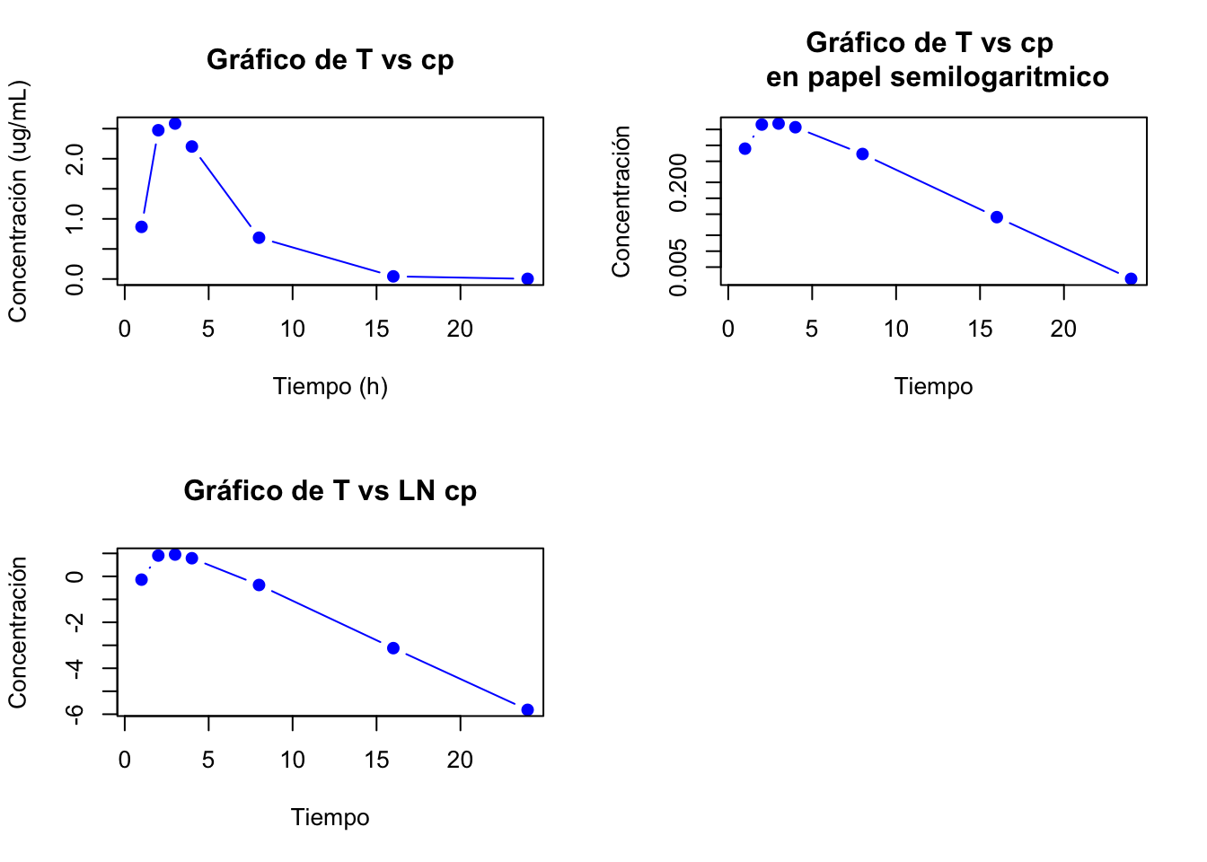\[ F=\frac{6.43 \mu g\cdot h/mL}{4.65\mu g\cdot h/mL}\cdot \frac{100 mg}{100 mg}\cdot \frac{14.93 L/h}{21.49 L/h}=0.96 \] Tome en cuenta que la estimación del \(Cl\) para la administración oral, se basó en un valor de \(F=1\). Lo ideal sería tener otros datos para poder estimar el valor de la biodisponibilidad absoluta.