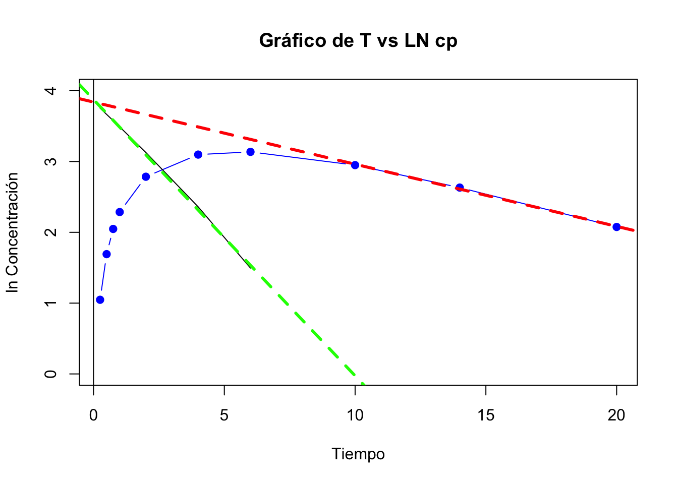 - \(C^0\) Es la ordenada del origen de las fases de absorción y eliminación en un modelo de un compartimiento con administración extravasal