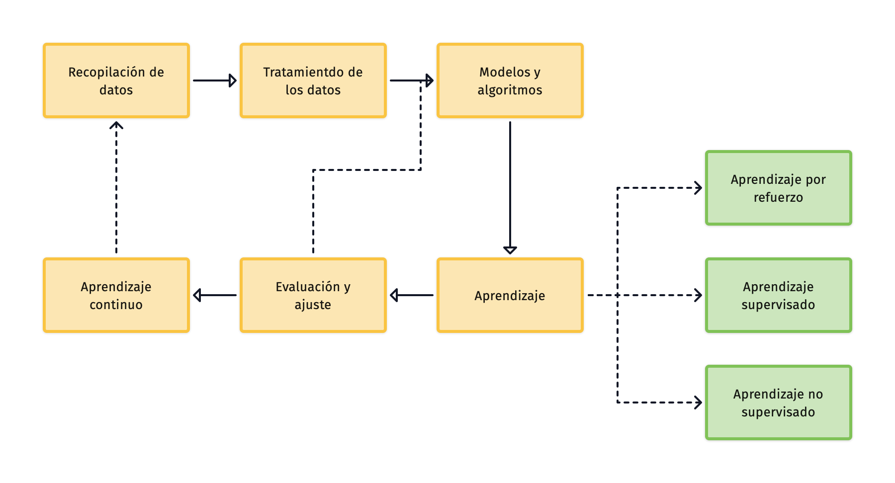 | Basado en reglas y lógica para la toma de decisiones. | Aprendizaje automático a partir de datos | Aprendizaje a través de la abstracción y reconocimiento de patrones en grandes conjuntos de datos. |