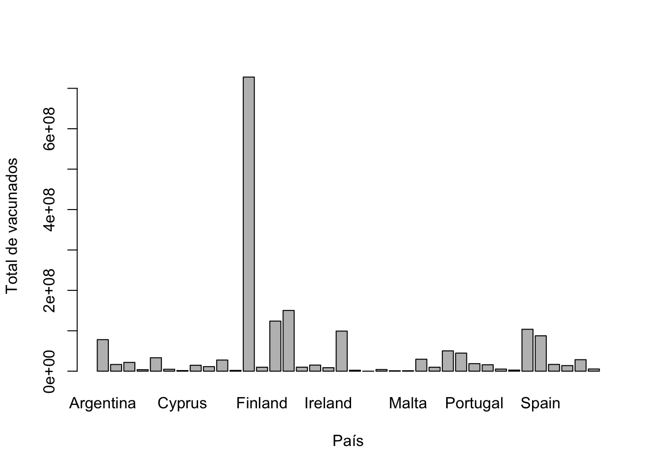 Utilizando la base de datos base de datos `vacunación` realice un gráfico de barras donde en el eje de las x se encuentren cada una de las regiones o países y en el eje de la y se encuentre el total de vacunados. Apóyese de la función `tapply`. La figura @fig_7_1 muestra el resultado de este ejercicio mas no el código empleado.
