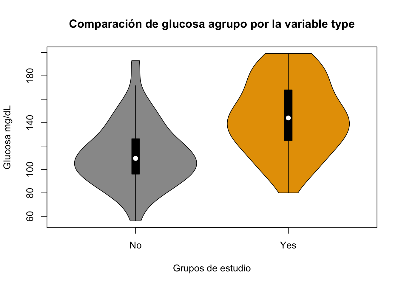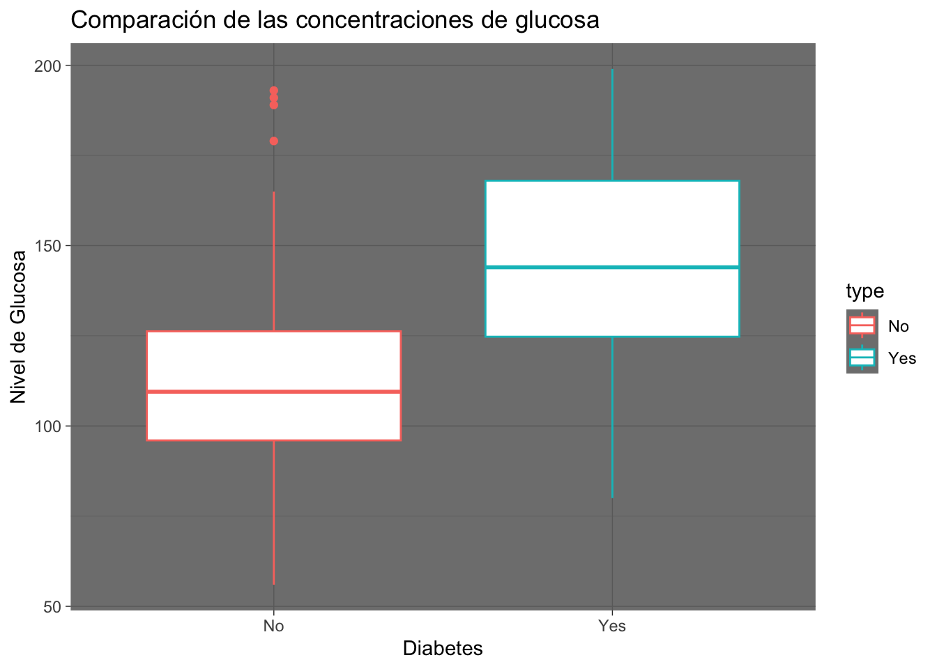 labs(title = "Comparación de las concentraciones de glucosa", x = "Diabetes", y = "Nivel de Glucosa") +