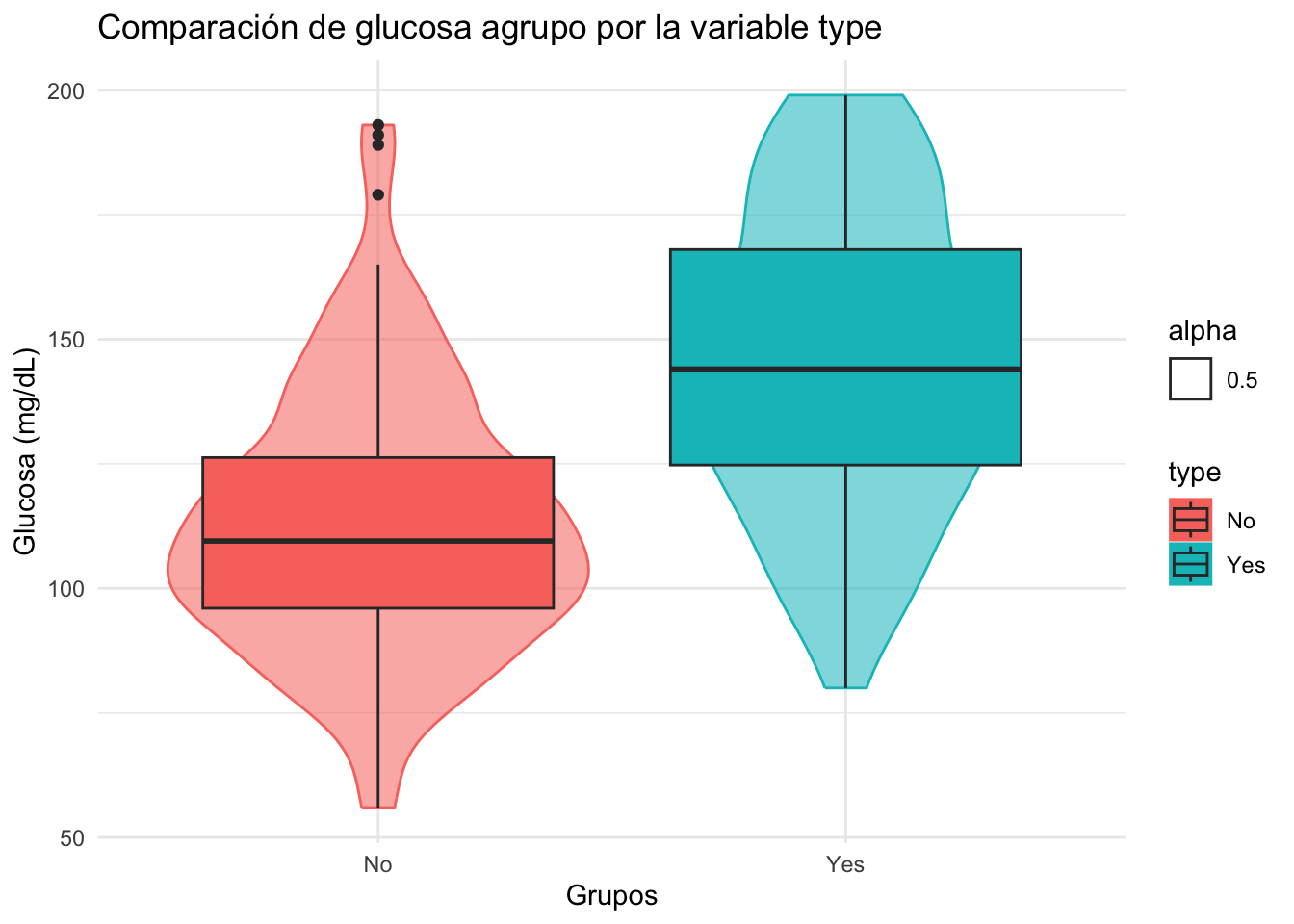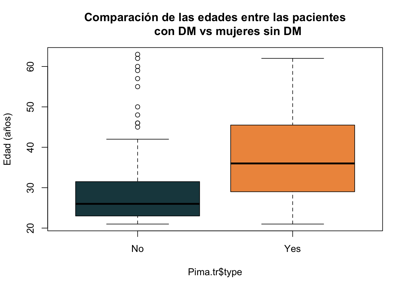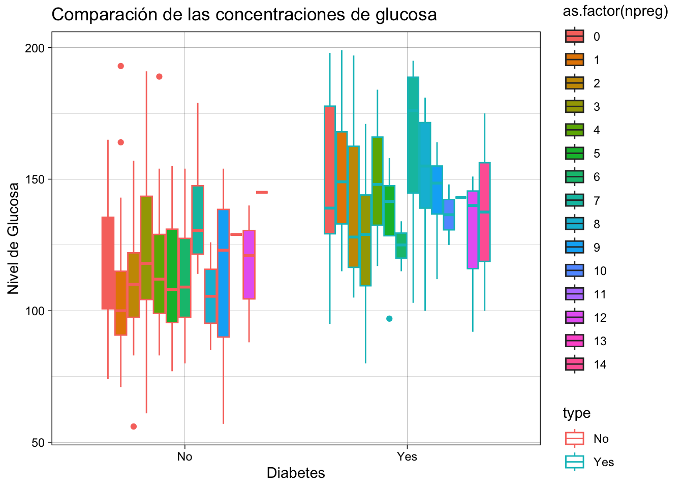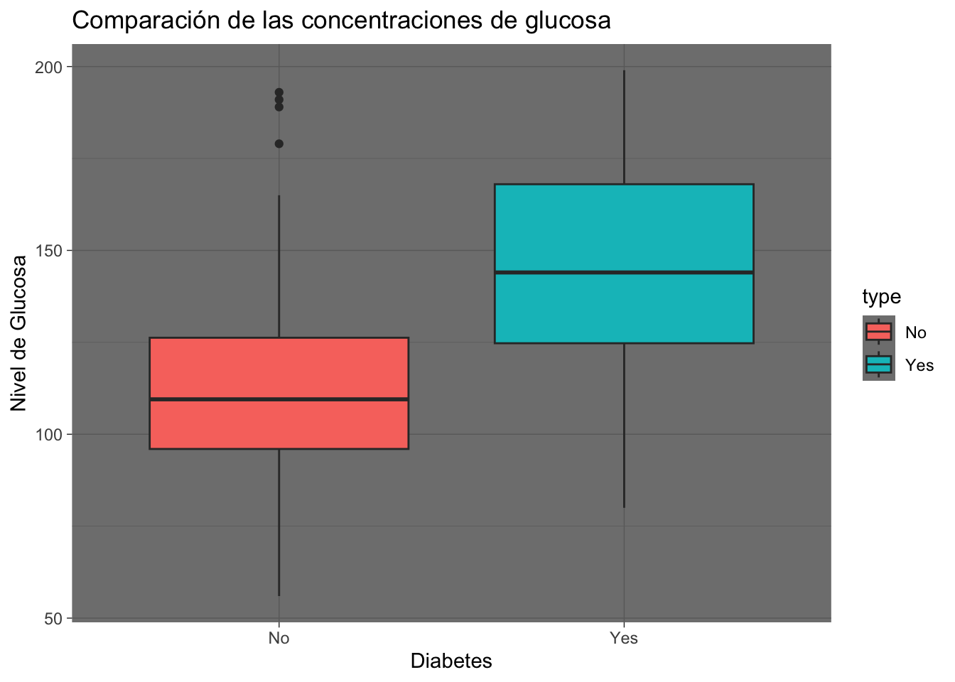 El código anterior, añadimos el argumento fill = type para aes los que nos permitió separar a las pacientes con y sin diabetes. El argumento fill en este caso colorea el interior de los boxplot, uno para las mujeres con diabetes y otro para las mujeres sin diabetes. Además, añadimos la geometría geom_boxplot y el tema dark mediante theme_dark