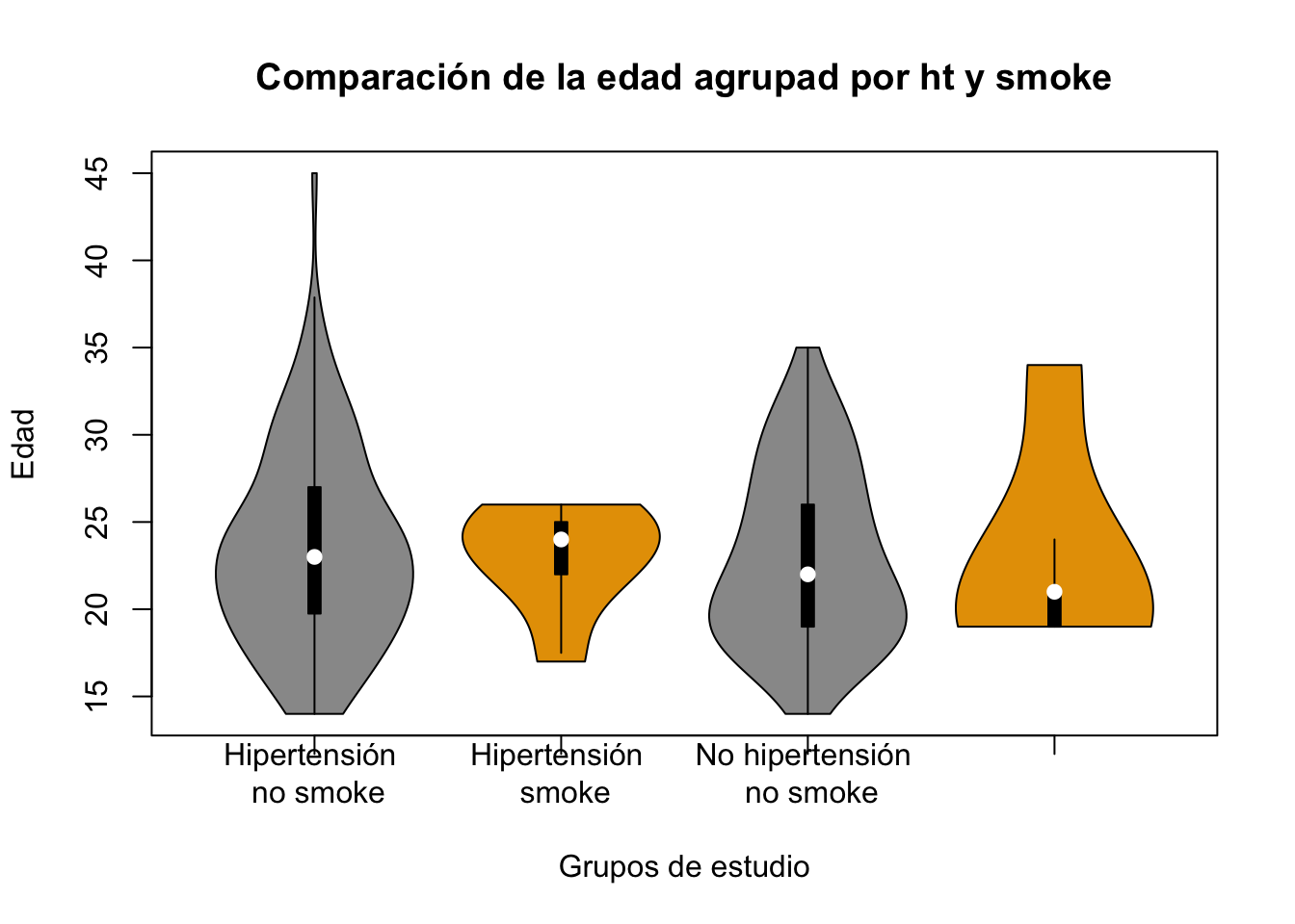 Ejercicio 8.11 Utilizando la base birthwt realice un gráfico de violín en el que agrupe la edad de la madre (age) de acuerdo al antecedente de hipertensión (ht) y el antecedente de tabaquismo de la madre (smoke)