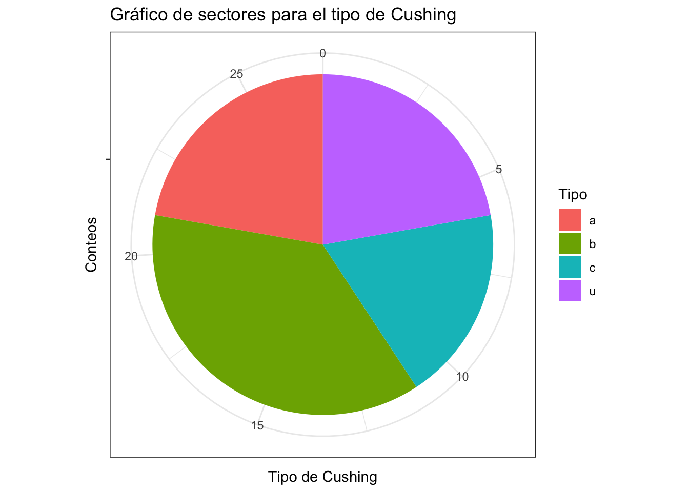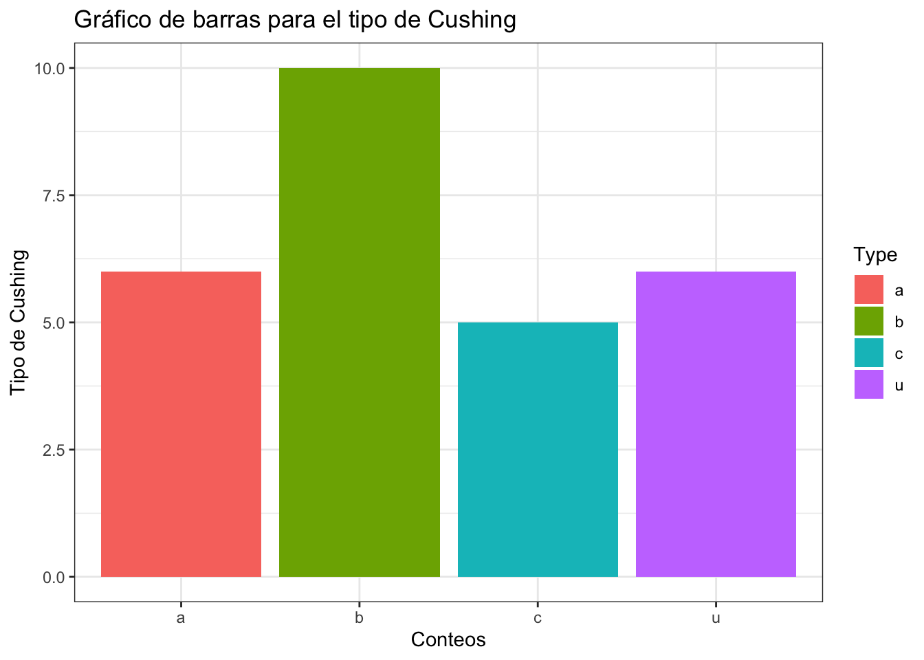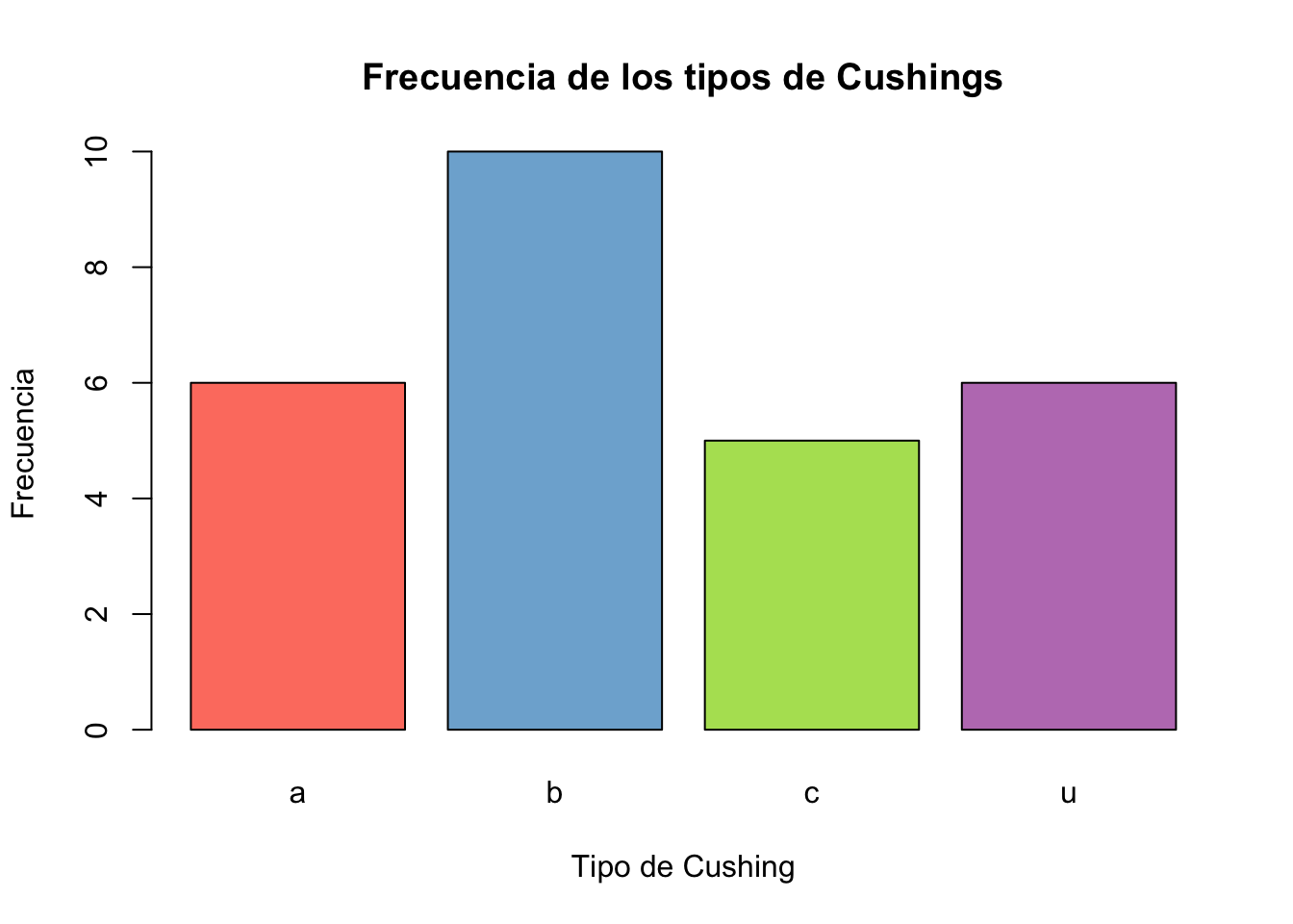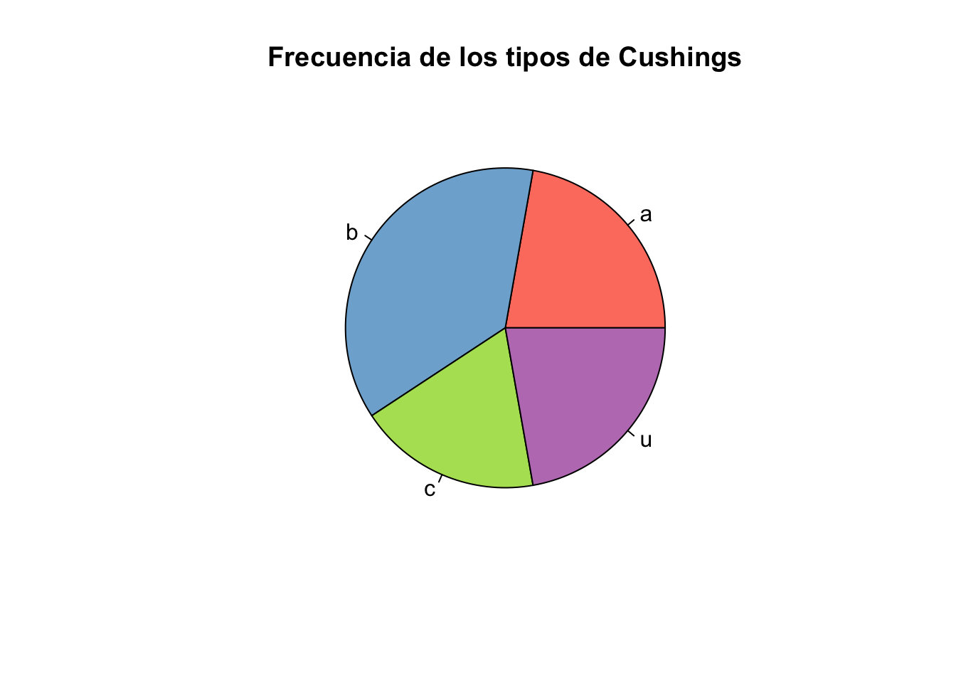 Ejercicio 8.12 Utilizando la base de datos Cushings de la librería MASS genere un gráfico de barras y otro de sectores para la variable Type. Cambie los colores, títulos de los ejes y el gráfico.
