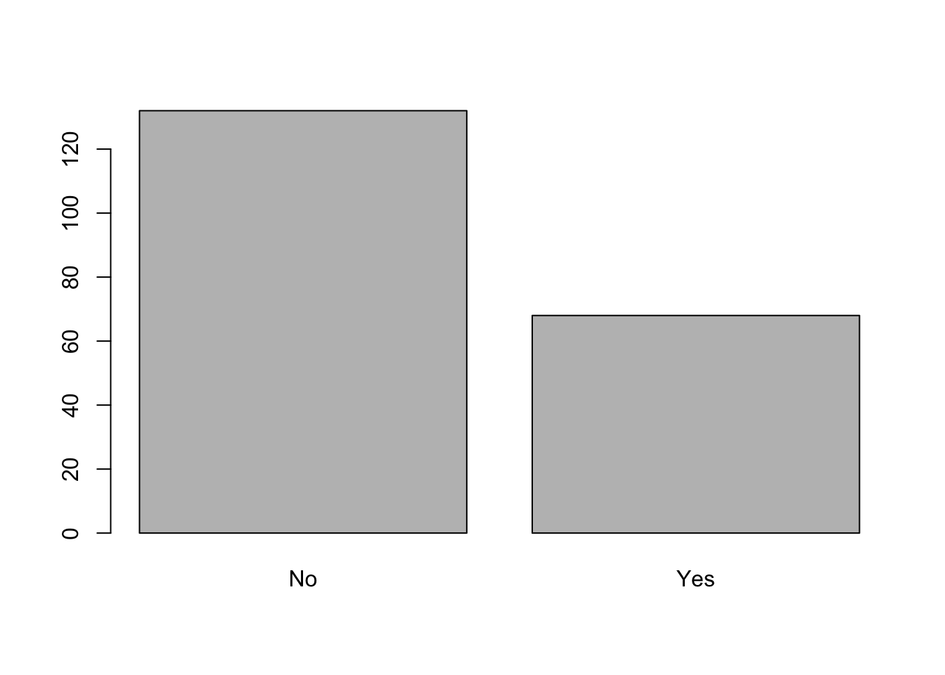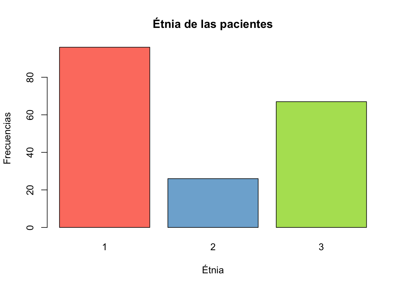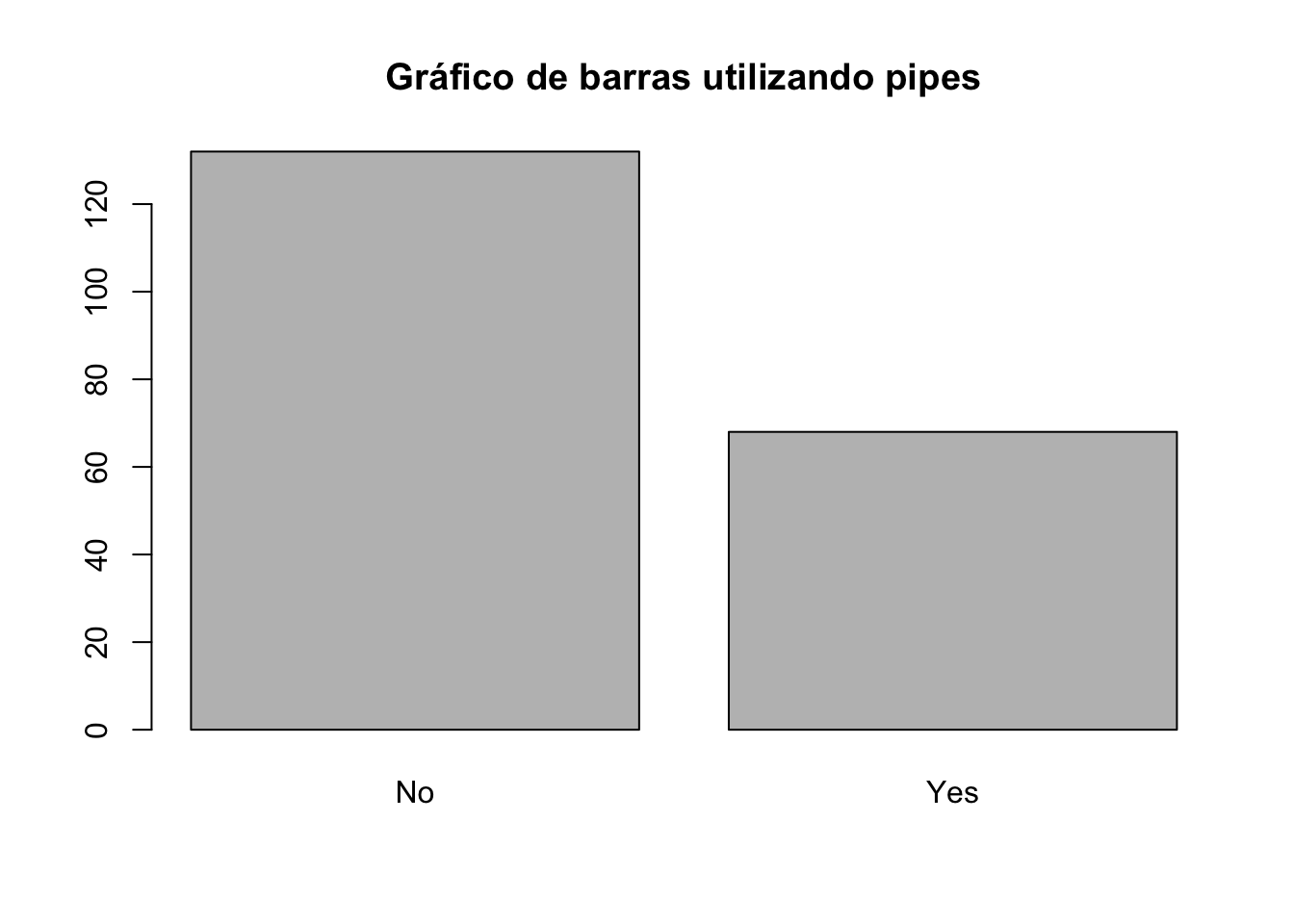 Los barplots se utilizan para graficar datos categóricos y casi nunca para datos numéricos. No es buena idea representar datos numéricos con barras, a menos de que quiera ocultar información. Para construir un gráfico de barras, aplicamos la función barplot(). Tenga en cuenta que primero aplicamos la función table() para contar las entradas de cada categoría en particular en la columna de datos de interés. Por ejemplo, podemos utilizar la función barplot() para representar cuantas pacientes tienen diabetes y cuantas pacientes no lo tienen, para ello utilizamos el siguiente código: