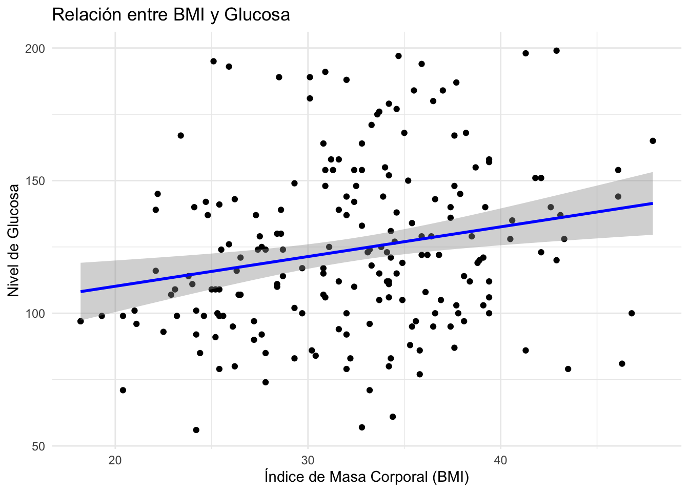 x = "Índice de Masa Corporal (BMI)", y = "Nivel de Glucosa")