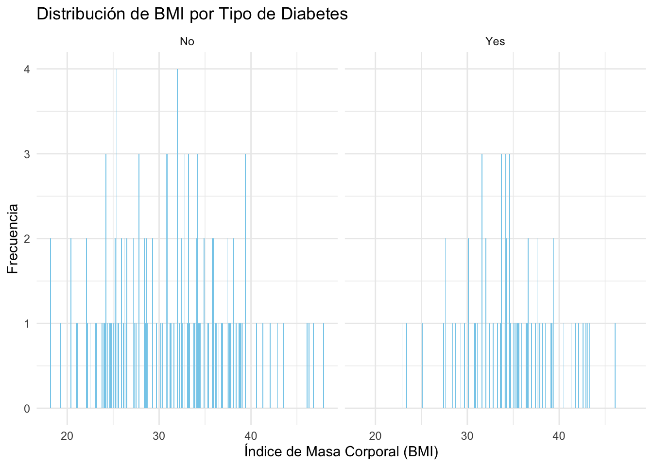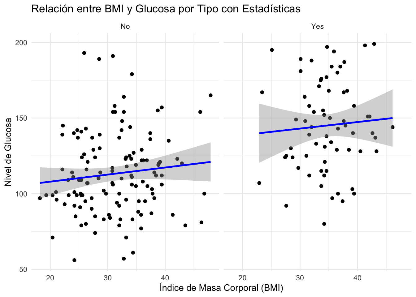 labs(title = "Relación entre BMI y Glucosa por Tipo con Estadísticas", x = "Índice de Masa Corporal (BMI)", y = "Nivel de Glucosa") +