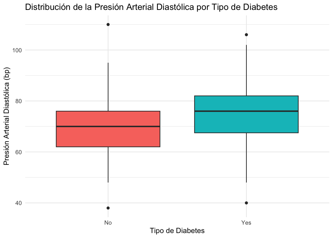 Ejercicio 8.21 Cree un boxplot que muestre la distribución de la presión arterial diastólica (bp) en función del tipo de diabetes (type). Aplicar un tema y personalizar el gráfico.