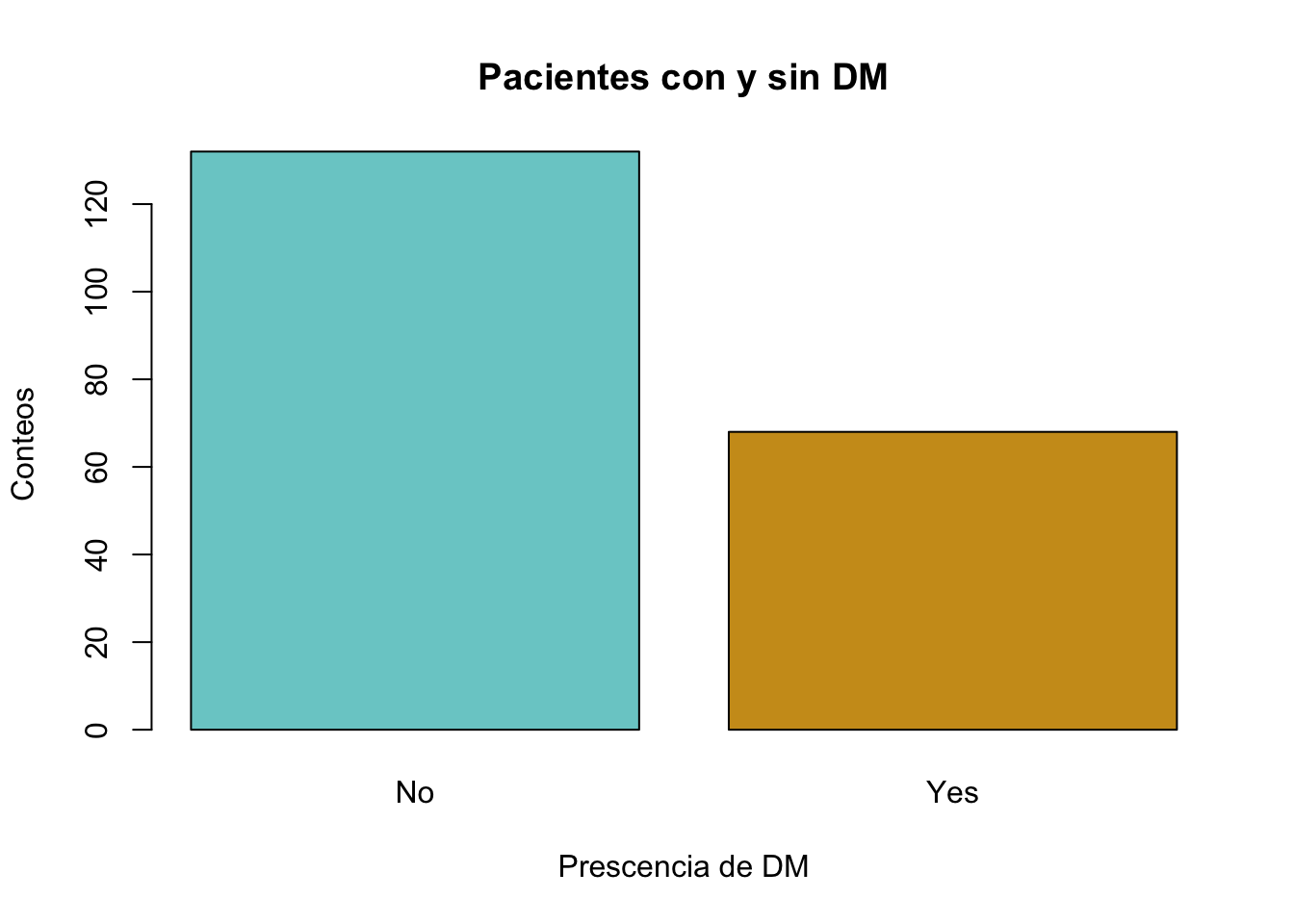 barplot(tab, main = "Pacientes con y sin DM", xlab="Prescencia de DM", ylab="Conteos", col= c("darkslategray3", "goldenrod3"))