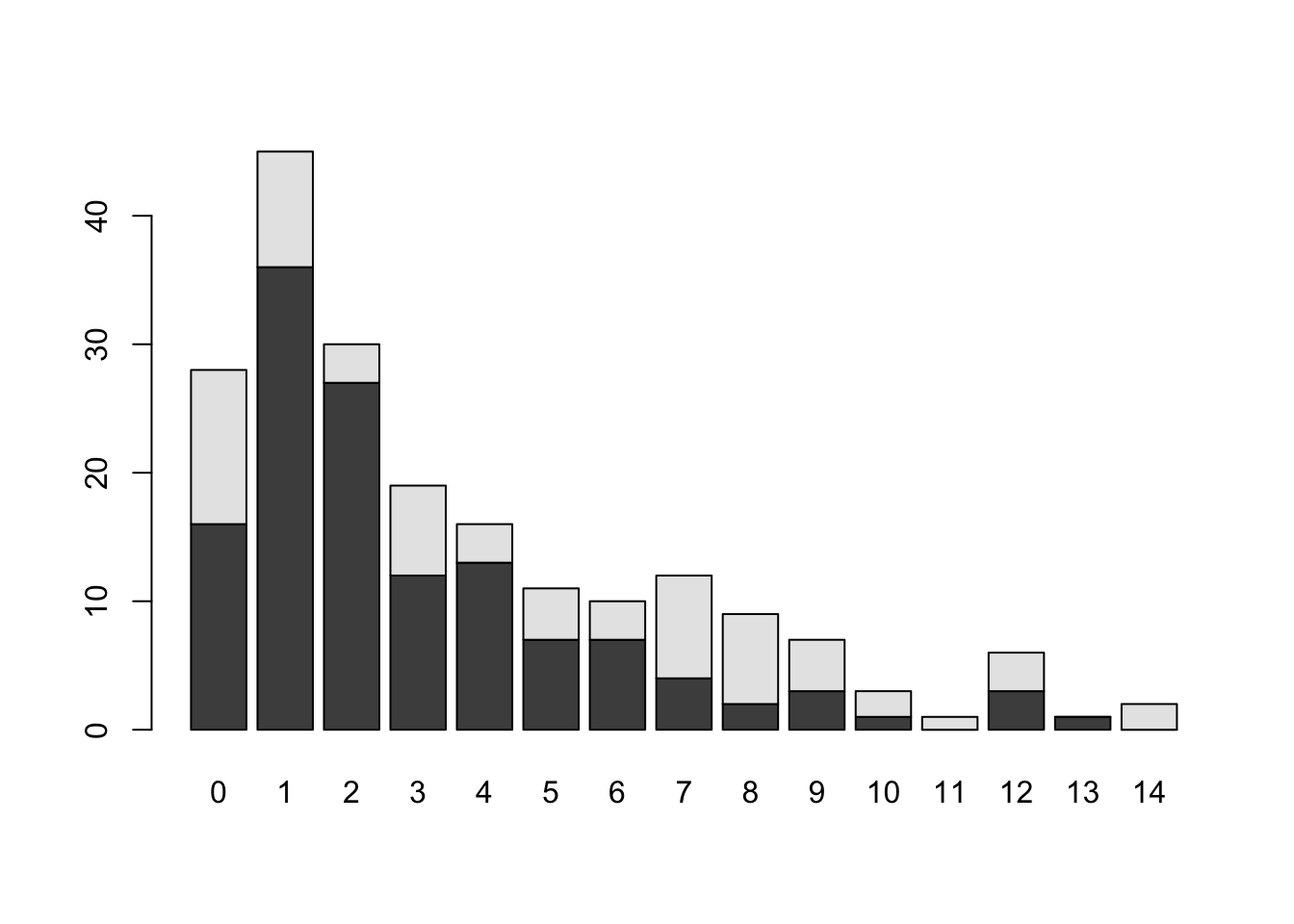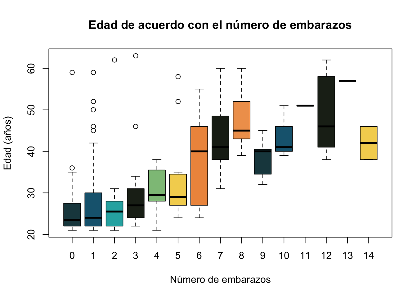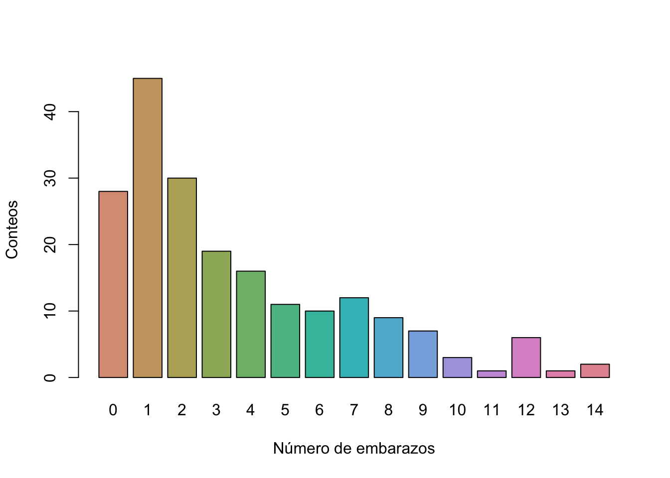 library(grDevices)Tener muchos colores no tendría sentido en la comparación del número de embarazos entre las pacientes con y sin diabetes. Por lo tanto creamos una nueva tabla únicamente con el número de embarazos.
