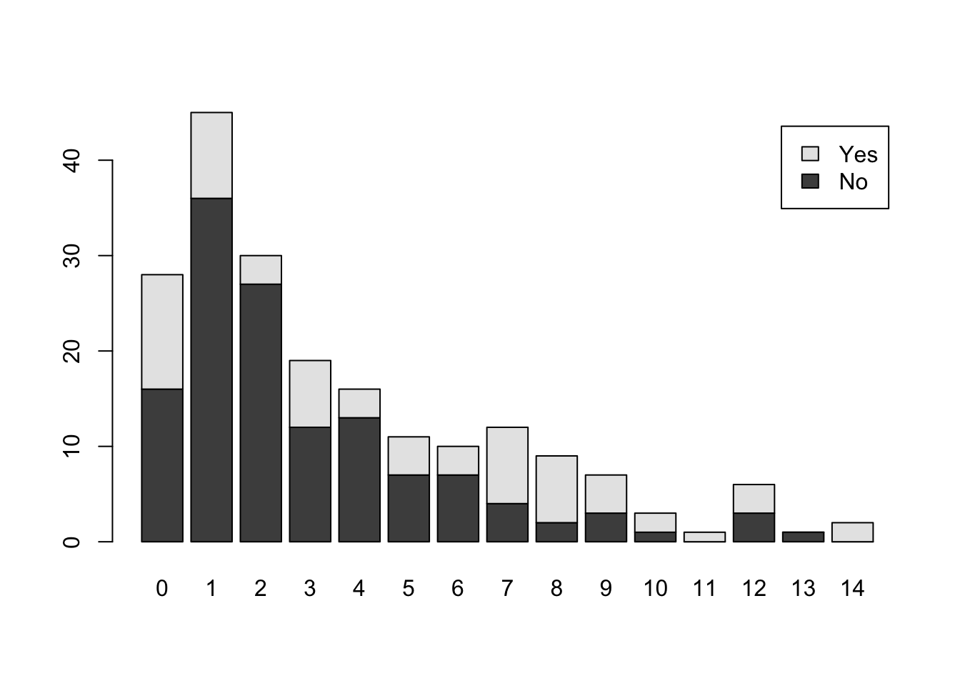 tab1 <- table(Pima.tr$type, Pima.tr$npreg)