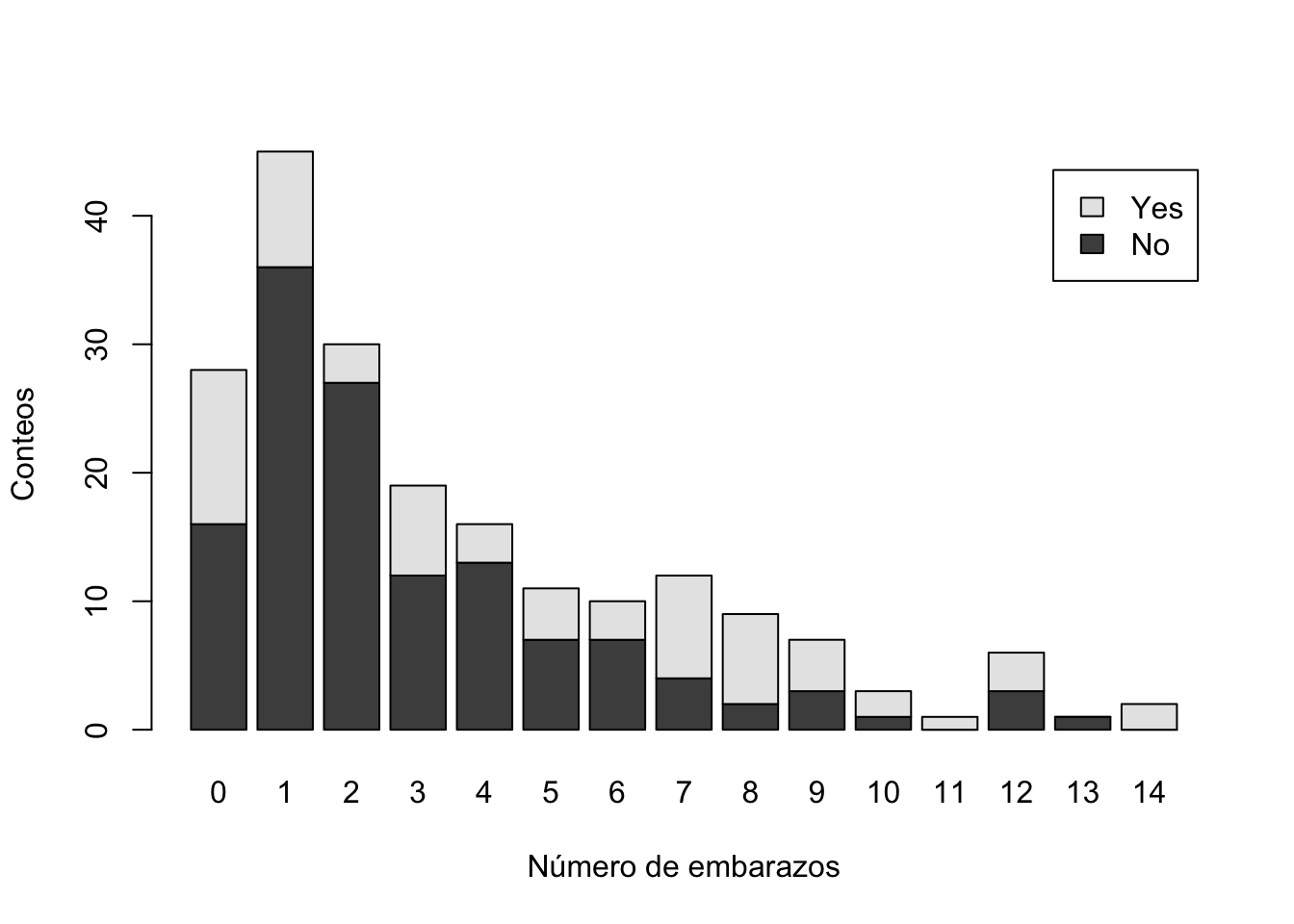 barplot(tab1, legend=rownames(tab1), xlab="Número de embarazos",