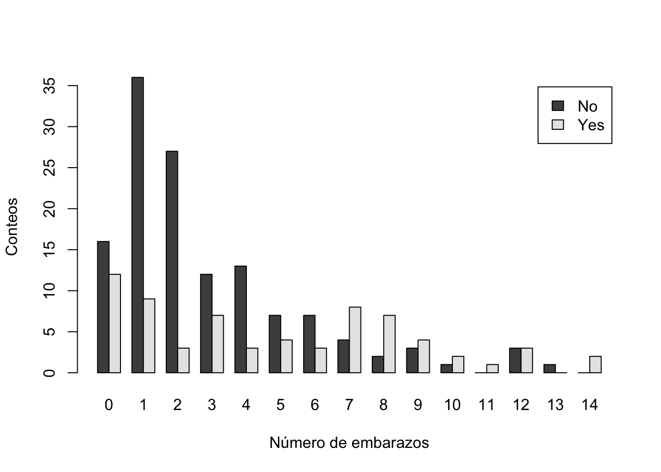 Podemos aumentar el número de clasificaciones que pueden ser representadas en el barplot si aumentamos la complejidad de nuestra tabla. Por ejemplo, la siguiente tabla muestra el número de embarazos agrupado entre las pacientes con y sin DM.