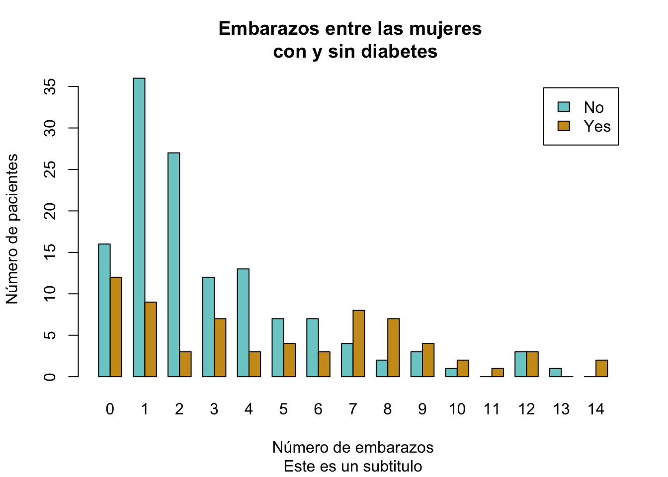 main = "Embarazos entre las mujeres \n con y sin diabetes", sub = "Este es un subtitulo",