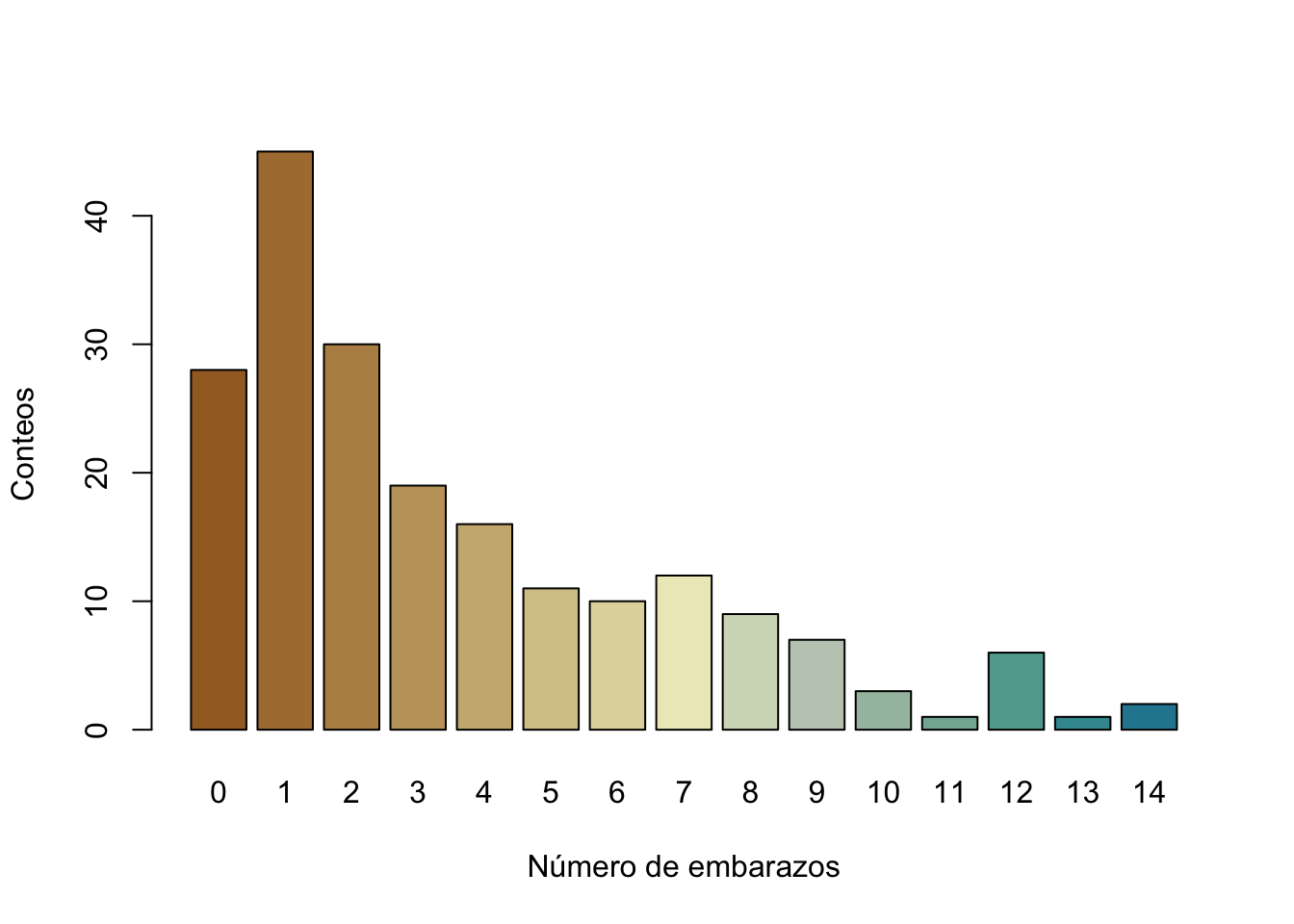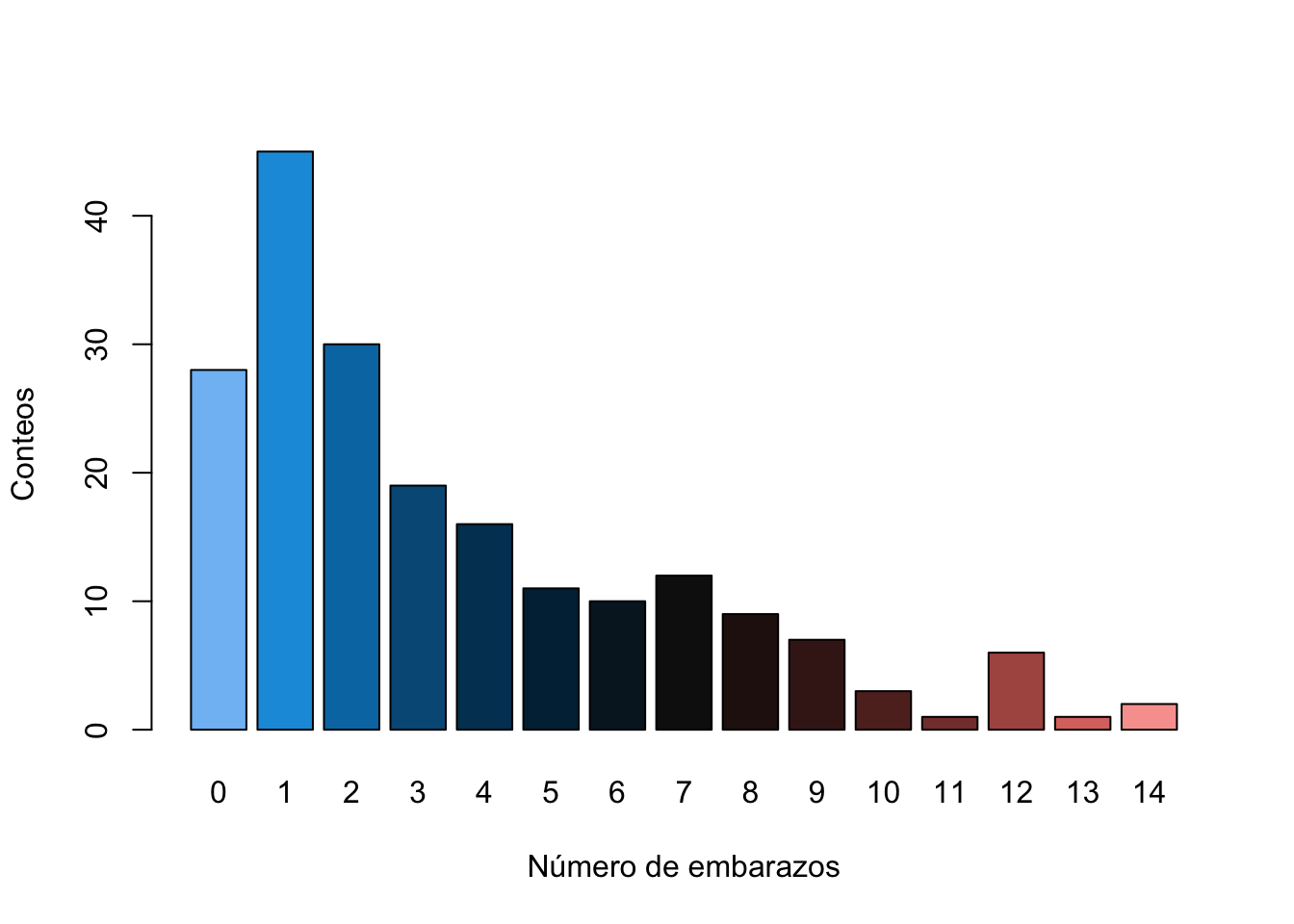 tab2 <- table(Pima.tr$npreg)Posteriormente podemos crear nuestras propias paletas de 14 colores (los que necesitamos para cada número de embarazo)