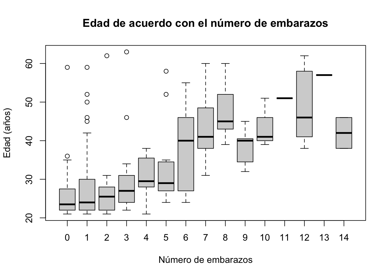 # Para obtener porcentges es necesario muttiplicar por 100barplot(tab3, xlab="Número de embarazos",