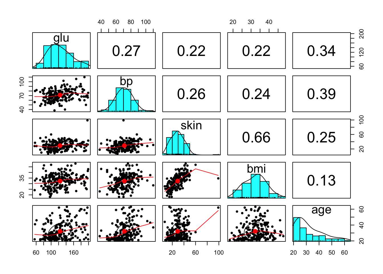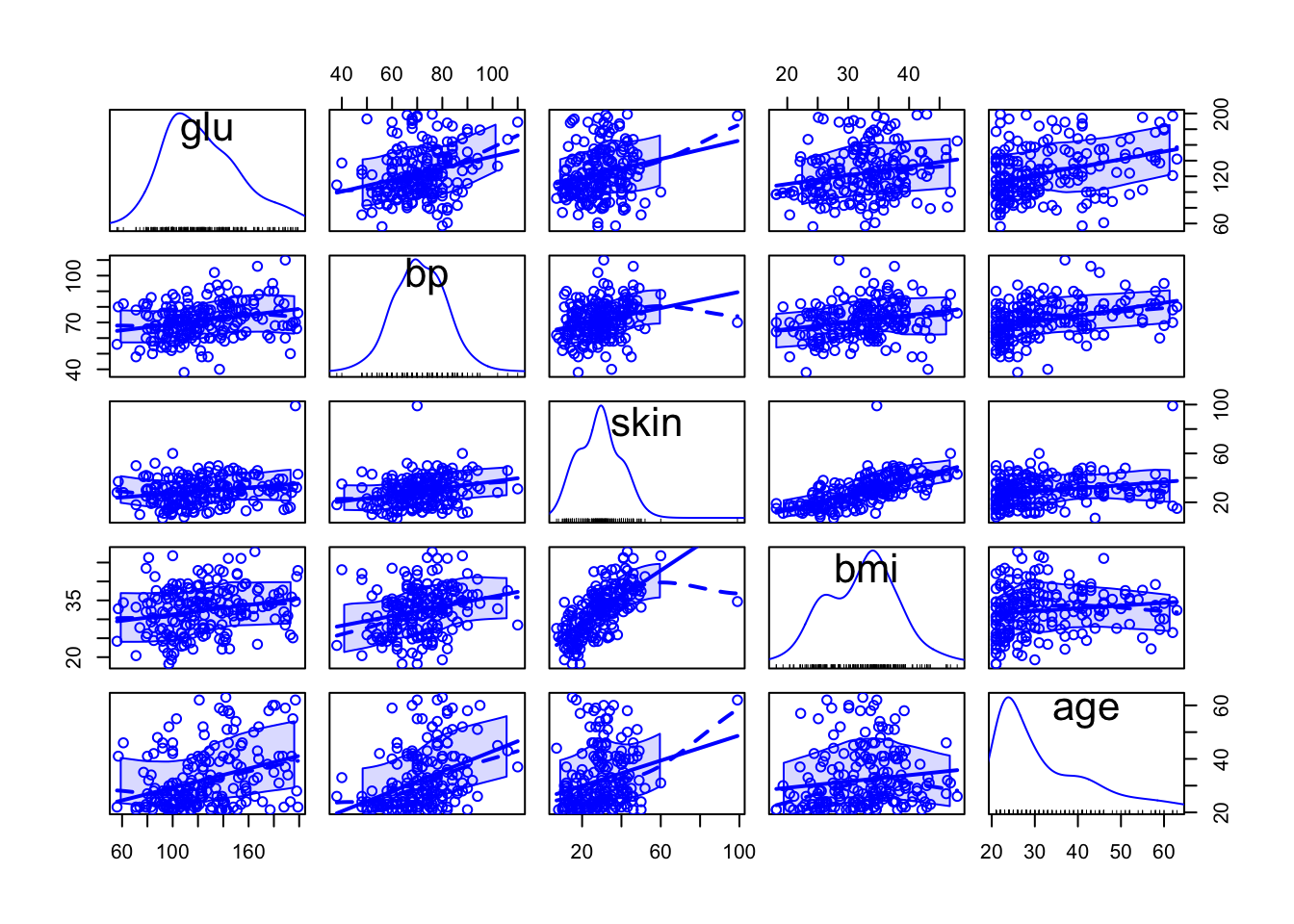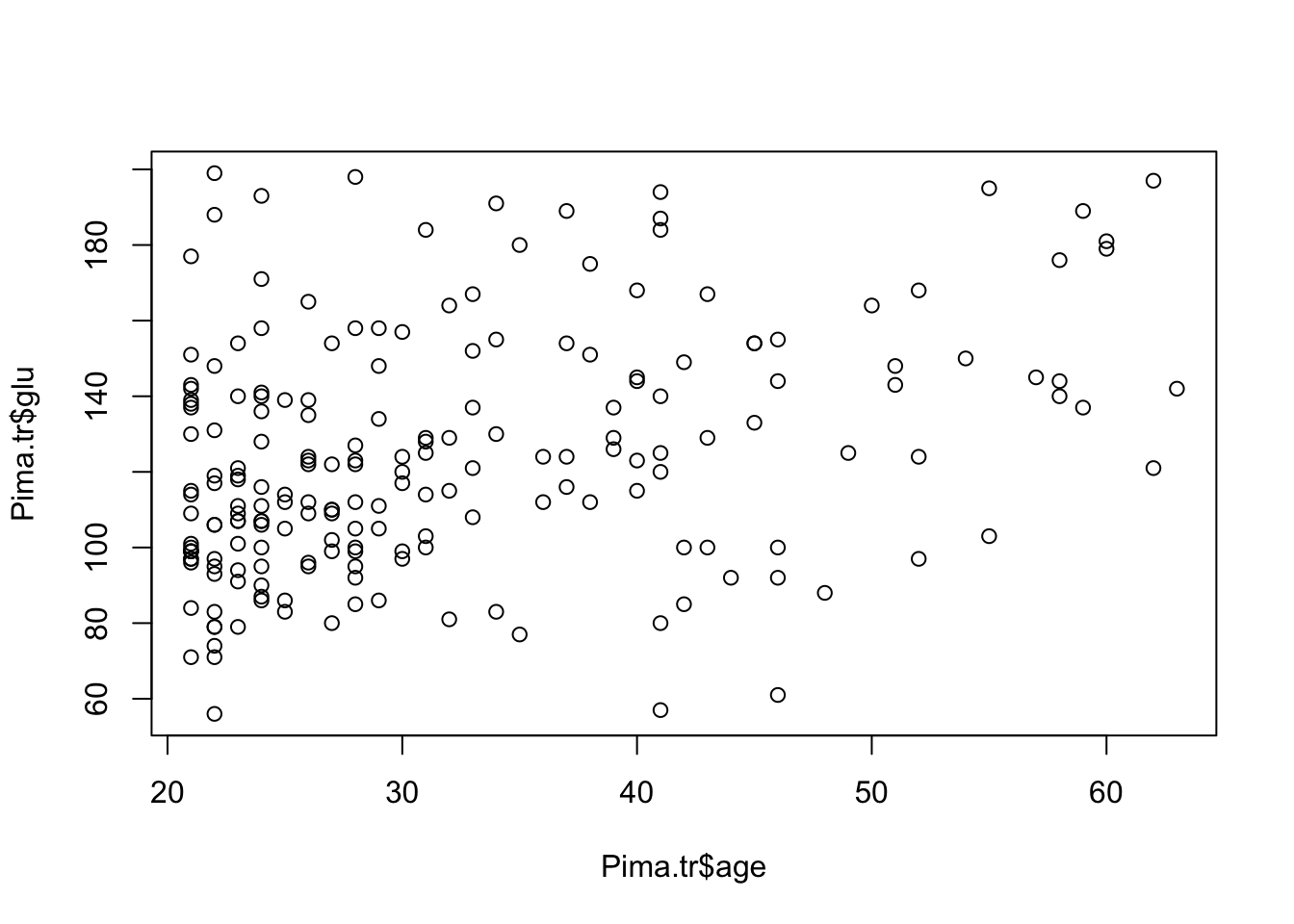 Ejercicio 8.19 Cree un gráfico de dispersión que muestre la relación entre el índice de masa corporal (bmi) y los niveles de glucosa (glu) en la base de datos Pima.tr. Añadir una línea de tendencia con su intervalo de confianza.