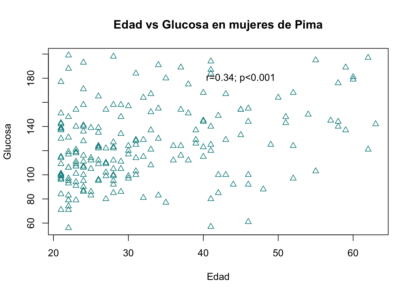 Ahora, supongamos que necesitamos crear dos gráficos de dispersión (uno al lado del otro) como el construido en el ejemplo anterior. Debe de mostrarse un gráfico para las mujeres con diabetes y otro para las mujeres sin diabetes. El siguiente código nos dará este gráfico: