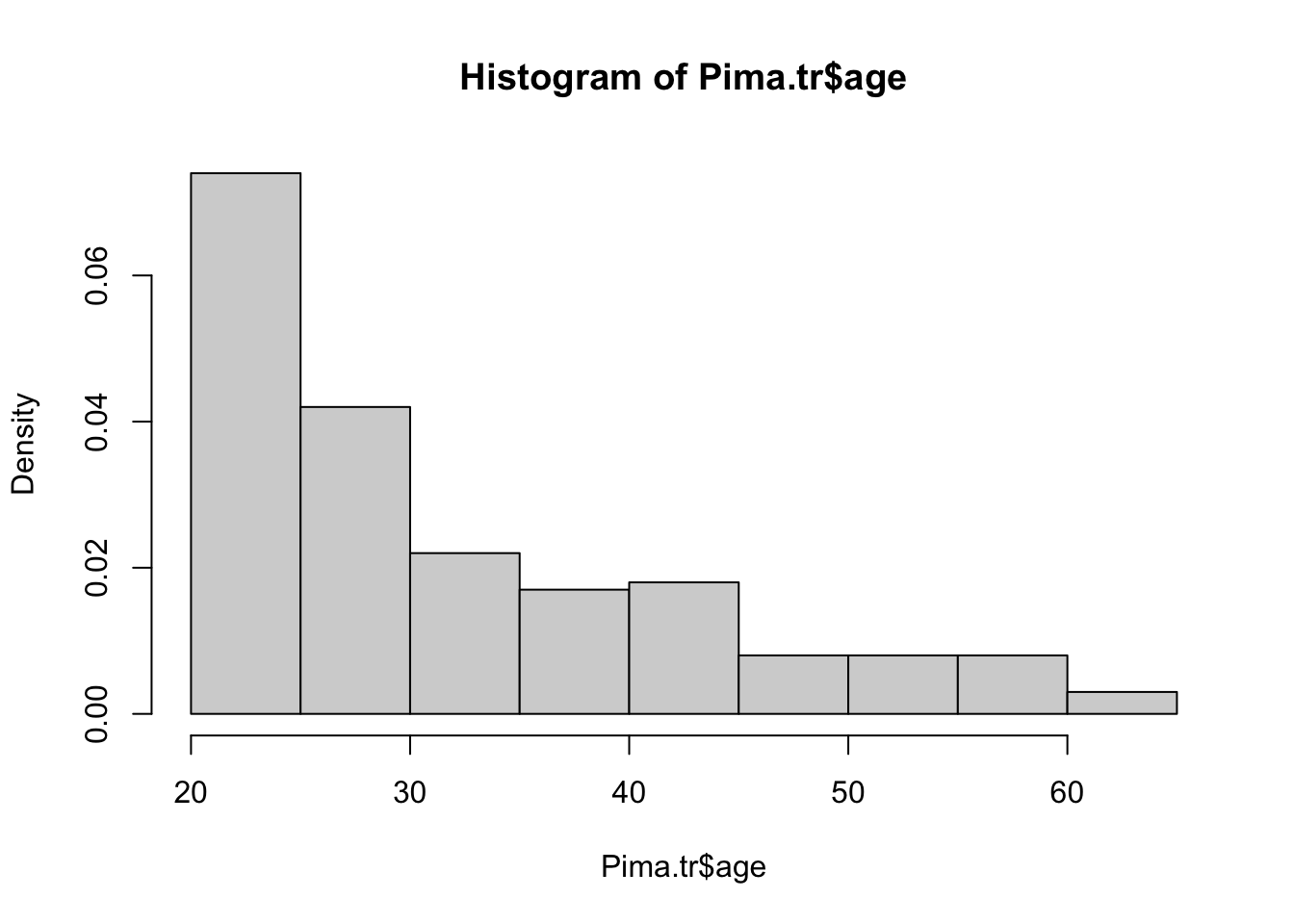 Vamos a construir un histograma básico. Para ello, vamos a utilizar la variable age del Dataframe Pima.tr de la librería MASS.