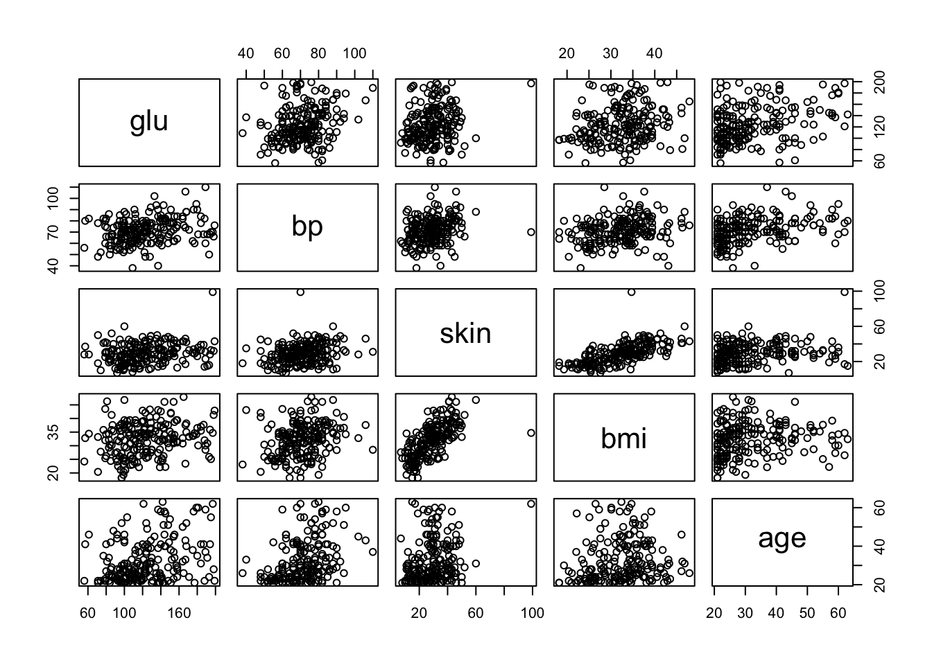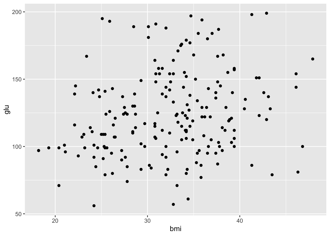 ggplot(mapping = aes(x = bmi, y = glu)) +