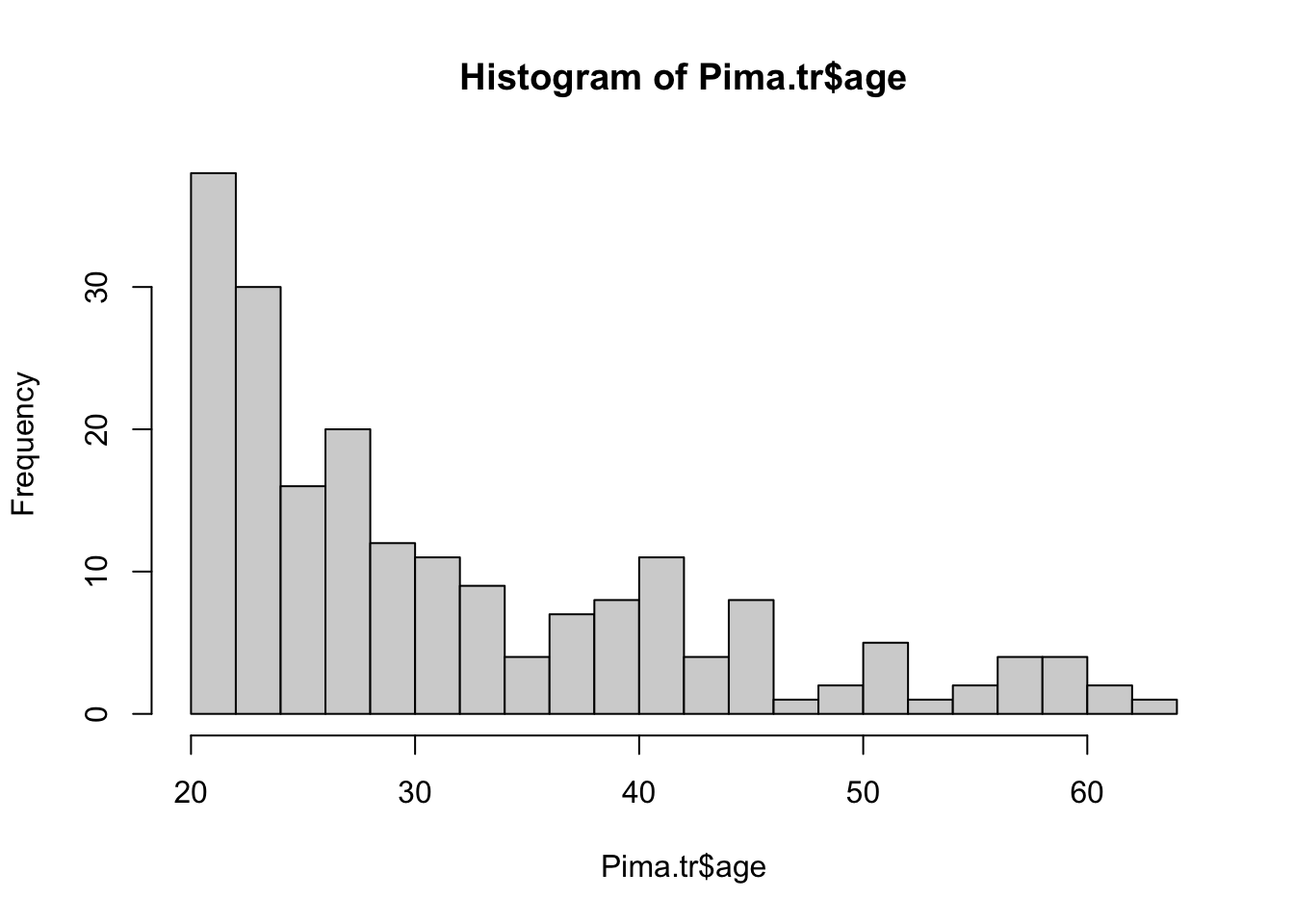 hist(Pima.tr$age, breaks = 20) #Histograma con 20 intervalos de clase