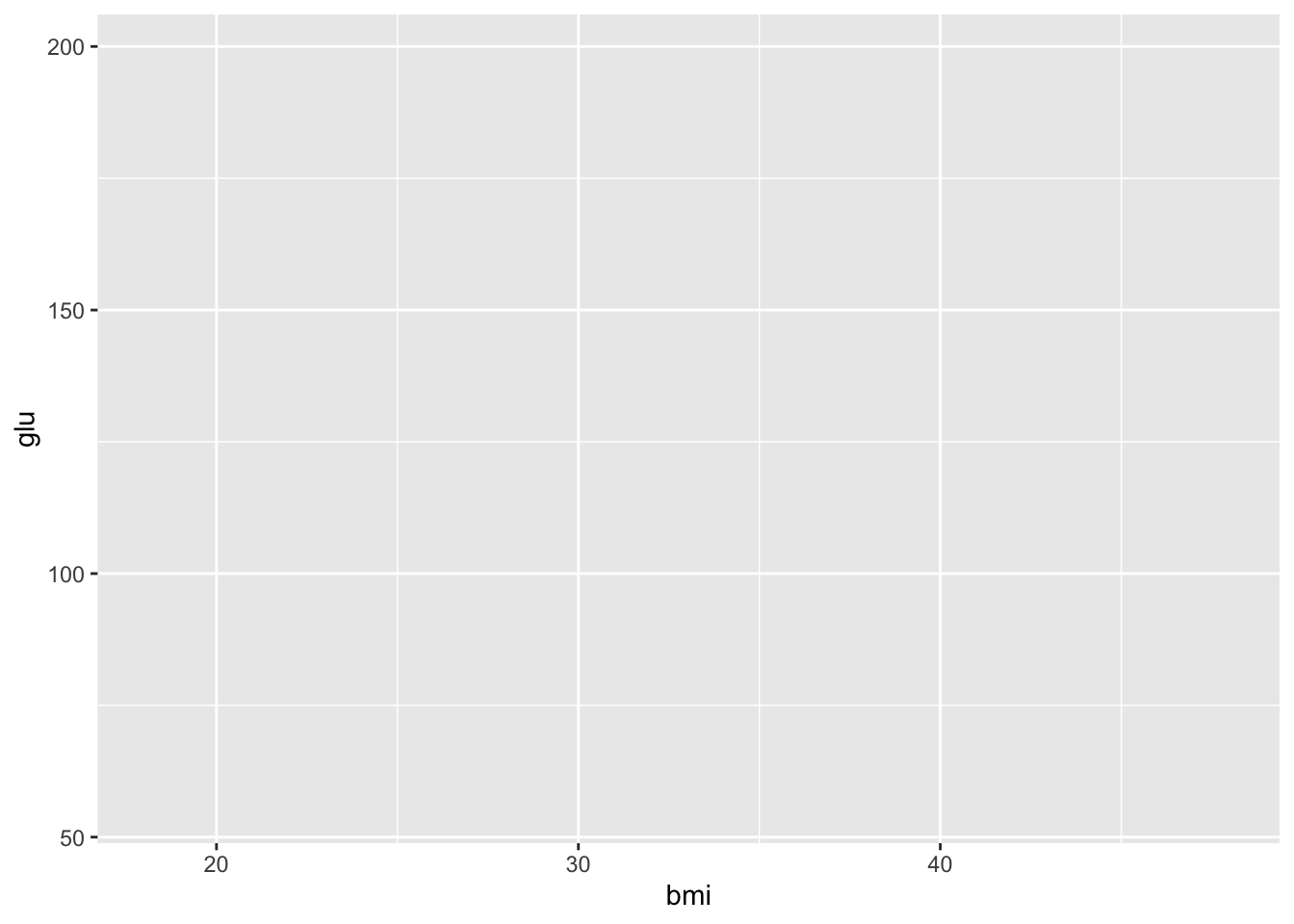 ggplot(mapping = aes(x=bmi, y=glu))Para indicarle a ggplot2 que variables deben de conformar el eje de las “x” y el eje de las “y” utilizamos el código: mapping = aes(x=bmi, y=glu). Donde indicamos la estética con aes mediante el “mapeo” mapping. Una explicación más técnica de esto sería: El argumento mapping en ggplot2 se utiliza para definir el “mapeo” estético de las variables de su conjunto de datos a las propiedades visuales de los elementos del gráfico, como los ejes, colores, tamaños, formas, etc. Se especifica mediante la función aes(), que crea una lista de mapeos estéticos.